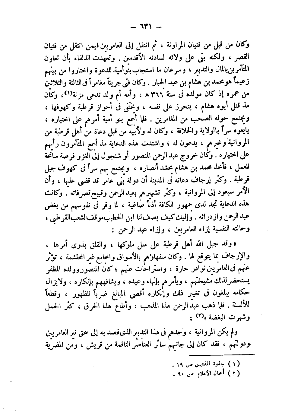 وكان من قبل من فتيان المراونية، ثم انتقل إلى العامربين فيمن انتقل من فتيان القصر، ولكنه بقي على ولائه لسادته الأقدمين. وتعهدت الذلفاء بأن تعاون المتآمرين بالمال والتدبير؛ وسرعان ما استجاب بنو أمية للدعوة واختاروا من بينهم زعيماً هو محمد بن هشام بن عبد الجبار. وكان فتى جريئاً مغامراً في الثالثة والثلاثين من عمره إذ كان مولده في سنة 366 هـ، وأمه أم ولد تدعى مزنة (¬1)، وكان مذ قتل أبوه هشام، يتحرز على نفسه، ويختفي في أحواز قرطبة وكهوفها، ويجتمع حوله الصحب من المغامرين. فلما أجمع بنو أمية أمرهم على اختياره، بايعوه سراً بالولاية والخلافة، وكان له ولأبيه من قبل دعاة من أهل قرطبة من المروانية وغيرهم، يدعون له؛ واشتدت هذه الدعاية مذ أجمع المتآمرون رأيهم على اختياره. وكان خروج عبد الرحمن المنصور أو شنجول إلى الغزو فرصة سانحة للعمل، فأخذ محمد بن هشام يحشد أنصاره، ويجتمع بهم سراً في كهوف جبل قرطبة. وكثر إرجاف دعاته في المدينة أن دولة بني عامر قد قضي عليها، وأن الأمر سيعود إلى المروانية، وكثر تشهيرهم بعبد الرحمن وقبيح تصرفاته. وكانت هذه الدعاية تجد لدى جمهور الكافة أذناً صاغية، لما وقر في نفوسهم من بغض عبد الرحمن وازدرائه. وإليك كيف يصف لنا ابن الخطيب موقف الشعب القرطبي، وحالته النفسية إزاء العامريين، وإزاء عبد الرحمن: