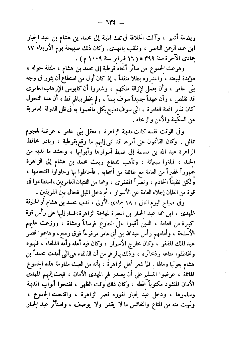 وبضعة أشهر، وآلت الخلافة في تلك الليلة إلى محمد بن هشام بن عبد الجبار ابن عبد الرحمن الناصر، وتلقب بالمهدي. وكان ذلك صبيحة يوم الأربعاء 17 جمادى الآخرة سنة 399 هـ (16 فبراير سنة 1009 م).