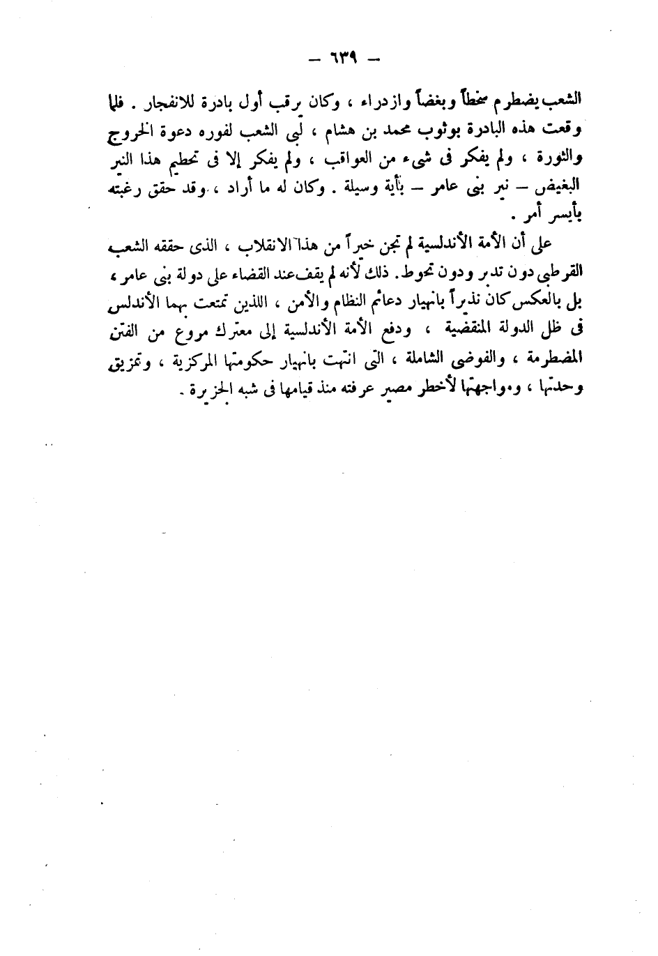 الشعب يضطرم سخطاً وبغضاً وازدراء، وكان يرقب أول بادرة للانفجار. فلما وقعت هذه البادرة بوثوب محمد بن هشام؛ لبى الشعب لفوره دعوة الخروج والثورة، ولم يفكر في شىء من العواقب، ولم يفكر إلا في تحطيم هذا النير البغيض - نير بني عامر - بأية وسيلة. وكان له ما أراد، وقد حقق رغبته بأيسر أمر.