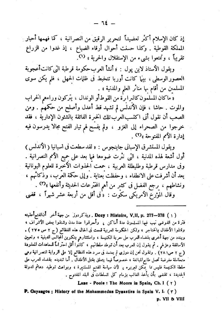 (¬1) II, p. 277 - 278. Dozy: Histoire, V. ويذكر دوزي من جهة أخرى أن الفتح أعقبته فترة من الفوضى نهب فيها المسلمون عدة أماكن، وأحرقوا عدة مدن وشنقوا بعض الأشراف، وقتلوا الأطفال بالخناجر، ولكن الحكومة العربية قمعت في الحال هذه الفظائع (ج 2 ص 275). ويندد من جهة أخرى بقضاء العرب على حرية الكنيسة، واستئثارهم بتكوين المجالس الدينية، وتعيين الأساقفة وعزلهم. ثم يقول إن العرب بعد أن توطد سلطانهم، كانوا أقل احتراما للمعاهدات المعقودة (ج 2 ص 281). ونقول نحن إن دوزي لم يعتمد في سرد هذه الفظائع إلا على الرواية النصرانية وهي متحاملة مغرضة تحمل طابع المبالغة، خصوصا فيما يتعلق بقتل الأطفال. أما تنديده بقضاء العرب على سلطة الكنيسة فليس مما يمكن تبريره، لأن سياسة الفتح المستنيرة، وبواعث توطيد دعائم الدولة الجديدة، تقضي بأن يأخذ الغالب بزمام كل السلطات في البلد المفتوح.