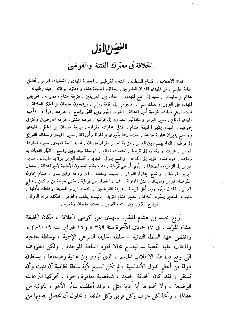 غداة الانقلاب. اقتسام السلطان. الشعب القرطبي. شخصية المهدي. اضطهاده للبربر. تحامل العامة عليهم. نفي المهدي للفتيان العامريين. إخفاؤه للخليفة هشام وادعاؤه بوفاته. عيثه وطغيانه. هشام بن سليمان. سعيه إلى خلع المهدي. القتال بين الفريقين. هزيمة هشام ومصرعه. تحريض المهدي على البربر والفتك بهم. مسيرهم إلى قلعة رباح. يرشحون سليمان بن الحكم للخلافة. استنصارهم بسانشو غرسية أمير قشتالة. الحرب بينهم وبين الفتى واضح. هزيمته وفراره. تأهب المهدي للدفاع. مسير البربر وحلفائهم النصارى إلى قرطبة. موقعة قنتش. هزيمة القرطبيين وتمزيق جموعهم. المهدي يظهر الخليفة هشام. فشل محاولته وفراره. مبايعة سليمان بن الحكم. المهدي وواضح يدبران محاولة جديدة. استنصارهما بأميرى برشلونة وأورقلة. مسير المهدي وحلفائه الفرنج إلى قرطبة. اللقاء بينهم وبين البربر. هزيمة البربر وفرار سليمان. تجديد البيعة للمهدي. مسيره لمطاردة البربر. هزيمته وارتداده إلى قرطبة. استعداده للدفاع. الوحشة بينه وبين واضح. ائتمار الفتيان به ومقتله. عود هشام المؤيد إلى الخلافة. واضح يتولى الحجابة. تمسك البربر بولاية سليمان. مسير البربر إلى الزهراء واحتلالها. عيثهم بأراضي قرطبة. هشام يقدم الحصون الأمامية لأمير قشتالة. حصار البربر لقرطبة. واضح يحاول الفرار. ضبطه ومقتله. ابن وداعة وابن مناو. هشام يحاول استرضاء البربر وسليمان. فشل المحاولة. اشتداد الحصار على قرطبة. مقتل حباسة بن ماكسن. هياج البربر. القتال بينهم وبين أهل قرطبة. هزيمة القرطبيين. اقتحام البربر للمدينة والفتك بأهلها. سليمان المستعين يسترد الخلافة. مصير هشام المؤيد. سليمان يتلقب بالظافر. تفكك عرى الدولة. توزيع الكور بين زعماء البربر. خلال سليمان وشعره.