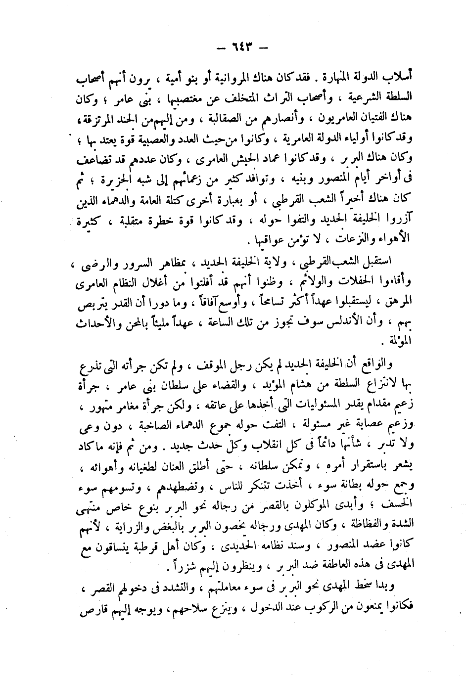 أسلاب الدولة المنهارة. فقد كان هناك المروانية أو بنو أمية، يرون أنهم أصحاب السلطة الشرعية، وأصحاب التراث المتخلف عن مغتصبيها، بني عامر؛ وكان هناك الفتيان العامريون، وأنصارهم من الصقالبة، ومن إليهم من الجند المرتزقة، وقد كانوا أولياء الدولة العامرية، وكانوا من حيث العدد والعصبية قوة يعتد بها؛ وكان هناك البربر، وقد كانوا عماد الجيش العامري، وكان عددهم قد تضاعف في أواخر أيام المنصور وبنيه، وتوافد كثير من زعمائهم إلى شبه الجزيرة؛ ثم كان هناك أخيراً الشعب القرطبي، أو بعبارة أخرى كتلة العامة والدهماء الذين آزروا الخليفة الجديد والتفوا حوله، وقد كانوا قوة خطرة متقلبة، كثيرة الأهواء والنزعات، لا تؤمن عواقبها.