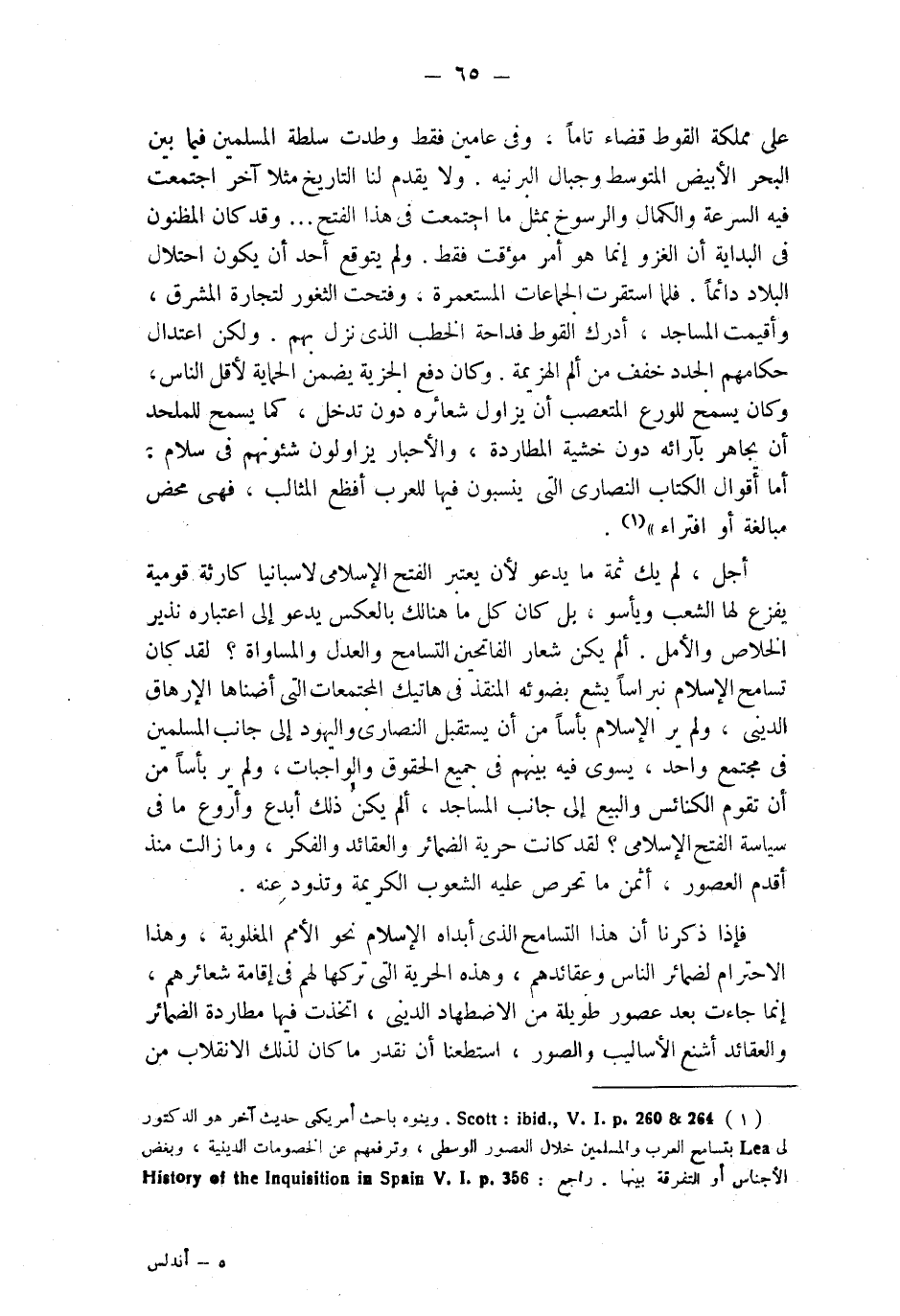 (¬1) Scott: ibid, V.I.P 260 & 264. وينوه باحث أمريكي حديث آخر هو الدكتور لي Lea بتسامح العرب والمسلمين خلال العصور الوسطى، وترفعهم عن الخصومات الدينية، وبغض الأجناس أو التفرقة بينها. راجع: History of the Inquisition in Spain V.I.P.356.