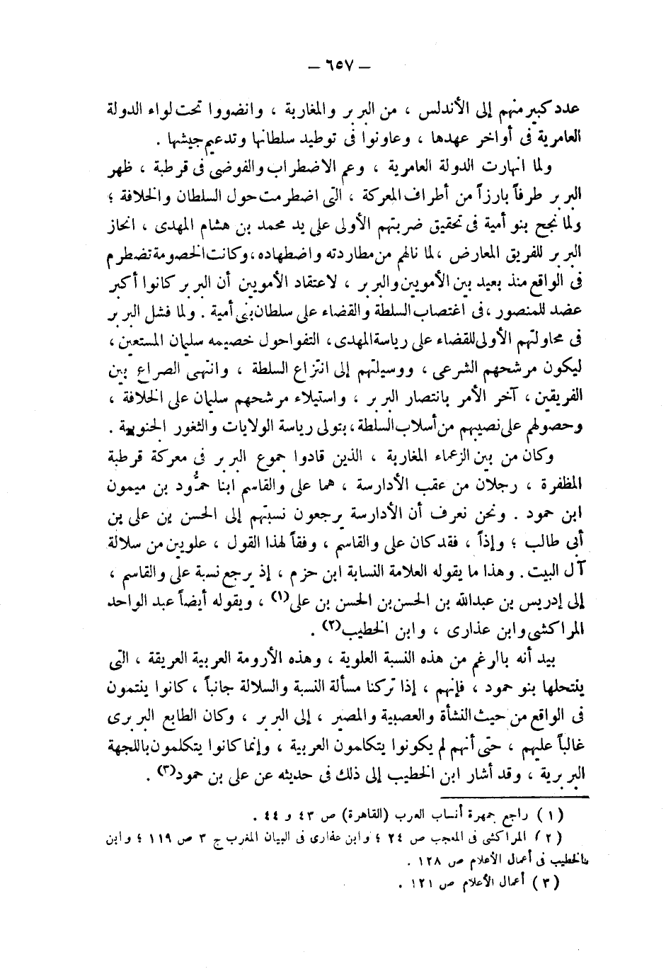 وكان من بين الزعماء المغاربة، الذين قادوا جموع البربر في معركة قرطبة المظفرة، رجلان من عقب الأدارسة، هما علي والقاسم ابنا حمُّود بن ميمون ابن حمود. ونحن نعرف أن الأدارسة يرجعون نسبتهم إلى الحسن بن علي بن أبى طالب؛ وإذاً، فقد كان علي والقاسم، وفقاً لهذا القول، علويين من سلالة آل البيت. وهذا ما يقوله العلامة النسابة ابن حزم، إذ يرجع نسبة علي والقاسم، إلى إدريس بن عبد الله بن الحسن بن الحسن بن علي (¬1)، ويقوله أيضاً عبد الواحد المراكشي وابن عذارى، وابن الخطيب (¬2).