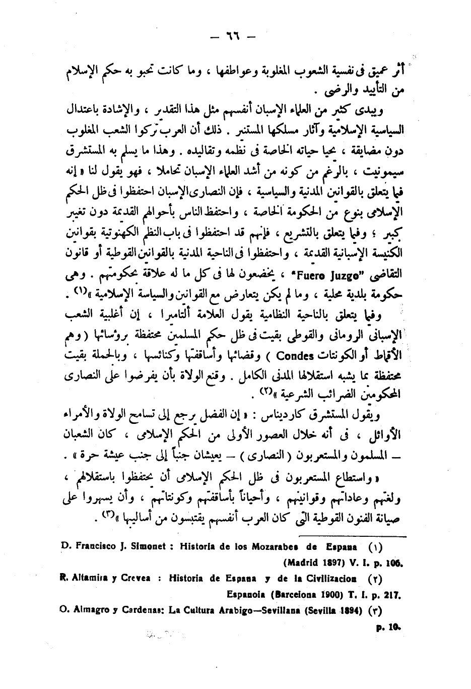 ويبدي كثير من العلماء الإسبان أنفسهم مثل هذا التقدير، والإشادة باعتدال السياسية الإسلامية وآثار مسلكها المستنير. ذلك أن العرب تركوا الشعب المغلوب دون مضايقة، يحيا حياته الخاصة في نظمه وتقاليده. وهذا ما يسلم به المستشرق سيمونيت، بالرغم من كونه من أشد العلماء الإسبان تحاملا، فهو يقول لنا " إنه فيما يتعلق بالقوانين المدنية والسياسية، فإن النصارى الإسبان احتفظوا في ظل حكم الإسلامي بنوع من الحكومة الخاصة، واحتفظ الناس بأحوالهم القديمة دون تغيير كبير؛ وفيما يتعلق بالتشريع، فإنهم قد احتفظوا في باب النظم الكهنوتية بقوانين الكنيسة الإسبانية القديمة، واحتفظوا في الناحية المدنية بالقوانين القوطية أو قانون التقاضي " Fuero Juzgo "، يخضعون لها في كل ما له علاقة بحكومتهم. وهي حكومة بلدية محلية، وما لم يكن يتعارض مع القوانين والسياسة الإسلامية " (¬1).