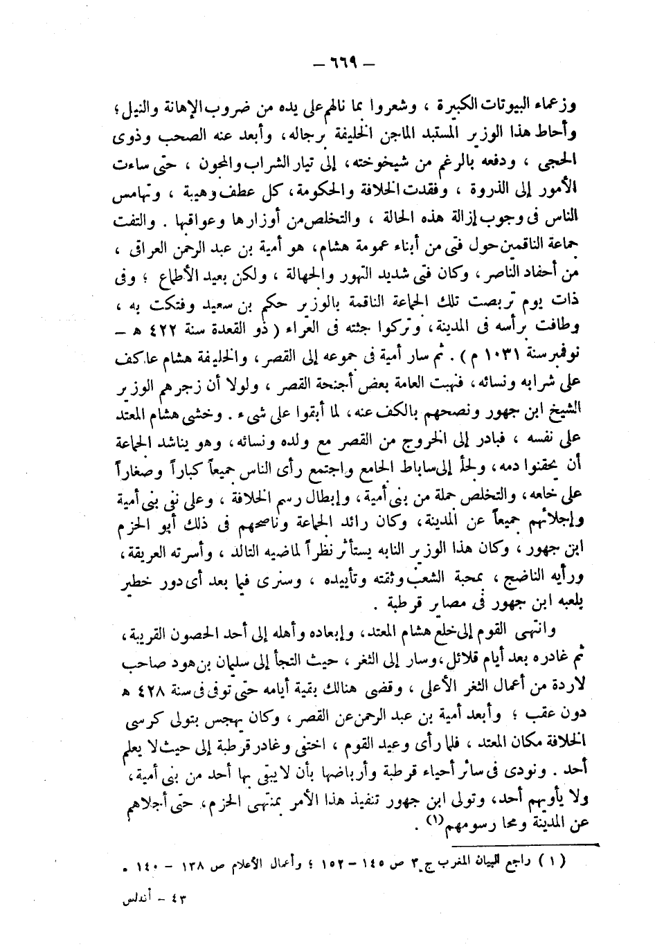 وزعماء البيوتات الكبيرة، وشعروا بما نالهم على يده من ضروب الإهانة والنيل؛ وأحاط هذا الوزير المستبد الماجن الخليفة برجاله، وأبعد عنه الصحب وذوي الحجي، ودفعه بالرغم من شيخوخته، إلى تيار الشراب والمجون، حتى ساءت الأمور إلى الذروة، وفقدت الخلافة والحكومة، كل عطف هيبة، وتهامس الناس في وجوب إزالة هذه الحالة، والتخلص من أوزارها وعواقبها. والتفت جماعة الناقمين حول فتى من أبناء عمومة هشام، هو أمية بن عبد الرحمن العراقي، من أحفاد الناصر، وكان فتى شديد التهور والجهالة، ولكن بعيد الأطماع؛ وفي ذات يوم تربصت تلك الجماعة الناقمة بالوزير حكم بن سعيد وفتكت به، وطافت برأسه في المدينة، وتركوا جثته في العراء (ذو القعدة سنة 422 هـ - نوفمبر سنة 1031 م). ثم سار أمية في جموعه إلى القصر، والخليفة هشام عاكف على شرابه ونسائه، فنهبت العامة بعض أجنحة القصر، ولولا أن زجرهم الوزير الشيخ ابن جهور ونصحهم بالكف عنه، لما أبقوا على شىء. وخشي هشام المعتد على نفسه، فبادر إلى الخروج من القصر مع ولده ونسائه، وهو يناشد الجماعة أن يحقنوا دمه، ولجأ إلى ساباط الجامع واجتمع رأي الناس جميعاً كباراً وصغاراً على خلعه، والتخلص جملة من بني أمية، وإبطال رسم الخلافة، وعلى نفي بني أمية وإجلائهم جميعاً عن المدينة، وكان رائد الجماعة وناصحهم في ذلك أبو الحزم ابن جهور، وكان هذا الوزير النابه يستأثر نظراً لماضيه التالد، وأسرته العريقة، ورأيه الناضج، بمحبة الشعب وثقته وتأييده، وسنرى فيما بعد أي دور خطير يلعبه ابن جهور في مصاير قرطبة.