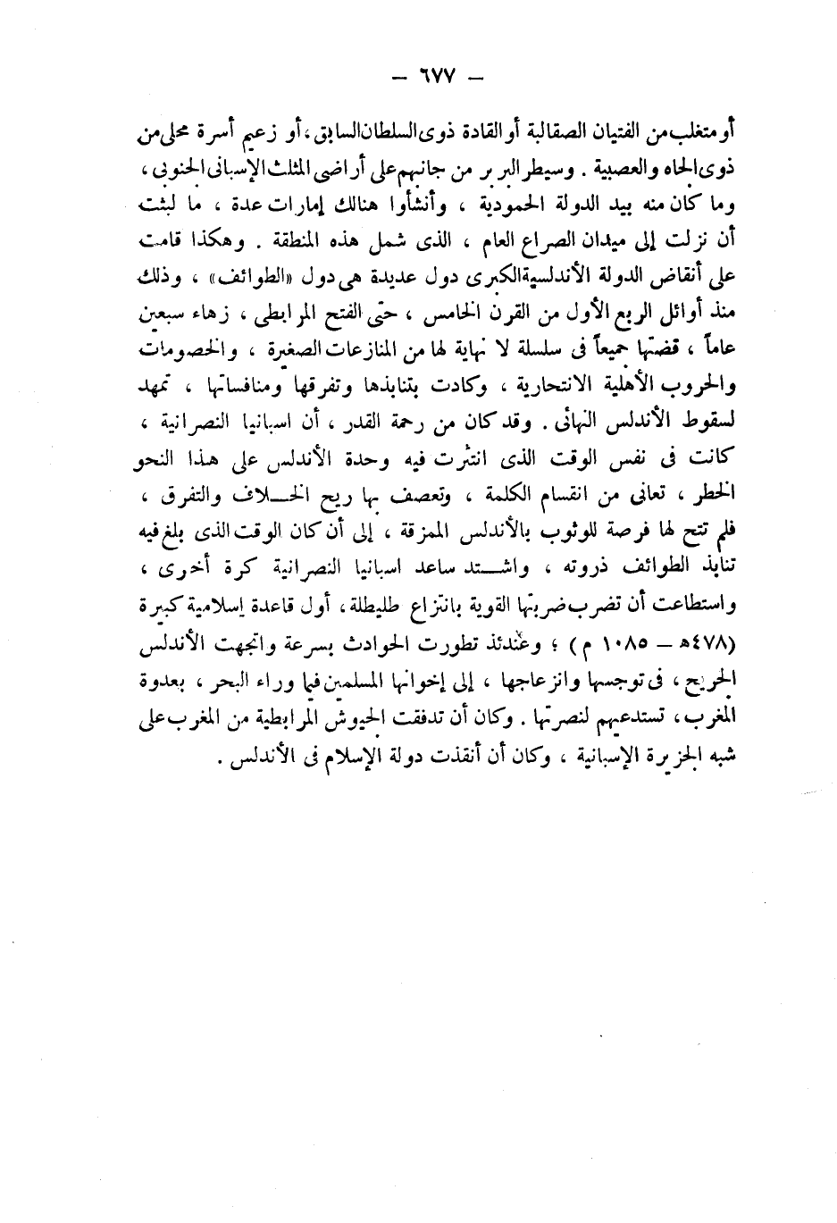 أو متغلب من الفتيان الصقالبة أو القادة ذوي السلطان السابق، أو زعيم أسرة محلي من ذوي الجاه والعصبية. وسيطر البربر من جانبهم على أراضي المثلث الإسباني الجنوبي، وما كان منه بيد الدولة الحمودية، وأنشأوا هنالك إمارات عدة، ما لبثت أن نزلت إلى ميدان الصراع العام، الذي شمل هذه المنطقة. وهكذا قامت على أنقاض الدولة الأندلسية الكبرى دول عديدة هي دول " الطوائف "، وذلك منذ أوائل الربع الأول من القرن الخامس، حتى الفتح المرابطي، زهاء سبعين عاماً، قضتها جميعاً في سلسلة لا نهاية لها من المنازعات الصغيرة، والخصومات والحروب الأهلية الانتحارية، وكادت بتنابذها وتفرقها ومنافساتها، تمهد لسقوط الأندلس النهائي. وقد كان من رحمة القدر، أن اسبانيا النصرانية، كانت في نفس الوقت الذي انتثرت فيه وحدة الأندلس على هذا النحو الخطر، تعاني من انقسام الكلمة، وتعصف بها ريح الخلاف والتفرق، فلم تتح لها فرصة للوثوب بالأندلس الممزقة، إلى أن كان الوقت الذي بلغ فيه تنابذ الطوائف ذروته، واشتد ساعد اسبانيا النصرانية كرة أخرى، واستطاعت أن تضرب ضربتها القوية بانتزاع طليطلة، أول قاعدة إسلامية كبيرة (478 هـ - 1085 م)؛ وعندئذ تطورت الحوادث بسرعة واتجهت الأندلس الجريحة، في توجسها وانزعاجها، إلى إخوانها المسلمين فيما وراء البحر، بعدوة المغرب، تستدعيهم لنصرتها. وكان أن تدفقت الجيوش المرابطية من المغرب على شبه الجزيرة الإسبانية، وكان أن أنقذت دولة الإسلام في الأندلس.