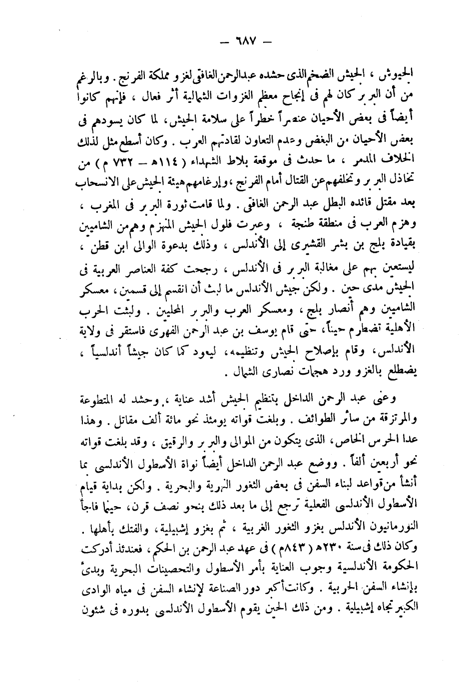 الجيوش، الجيش الضخم الذي حشده عبد الرحمن الغافقي لغزو مملكة الفرنج. وبالرغم من أن البربر كان لهم في إنجاح معظم الغزوات الشمالية أثر فعال، فإنهم كانوا أيضاً في بعض الأحيان عنصراً خطراً على سلامة الجيش، لما كان يسودهم في بعض الأحيان من البغض وعدم التعاون لقادتهم العرب. وكان أسطع مثل لذلك الخلاف المدمر، ما حدث في موقعة بلاط الشهداء (114 هـ - 732 م) من تخاذل البربر وتخلفهم عن القتال أمام الفرنج، وإرغامهم هيئة الجيش على الانسحاب بعد مقتل قائده البطل عبد الرحمن الغافقي. ولما قامت ثورة البربر في المغرب، وهزم العرب في منطقة طنجة، وعبرت فلول الجيش المنهزم وهم من الشاميين بقيادة بلج بن بشر القشيري إلى الأندلس، وذلك بدعوة الوالي ابن قطن، ليستعين بهم على مغالبة البربر في الأندلس، رجحت كفة العناصر العربية في الجيش مدى حين. ولكن جيش الأندلس ما لبث أن انقسم إلى قسمين، معسكر الشاميين وهم أنصار بلج، ومعسكر العرب والبربر المحليين. ولبثت الحرب الأهلية تضطرم حيناً، حتى قام يوسف بن عبد الرحمن الفهري فاستقر في ولاية الأندلس، وقام بإصلاح الجيش وتنظيمه، ليعود كما كان جيشاً أندلسياً، يضطلع بالغزو ورد هجمات نصارى الشمال.