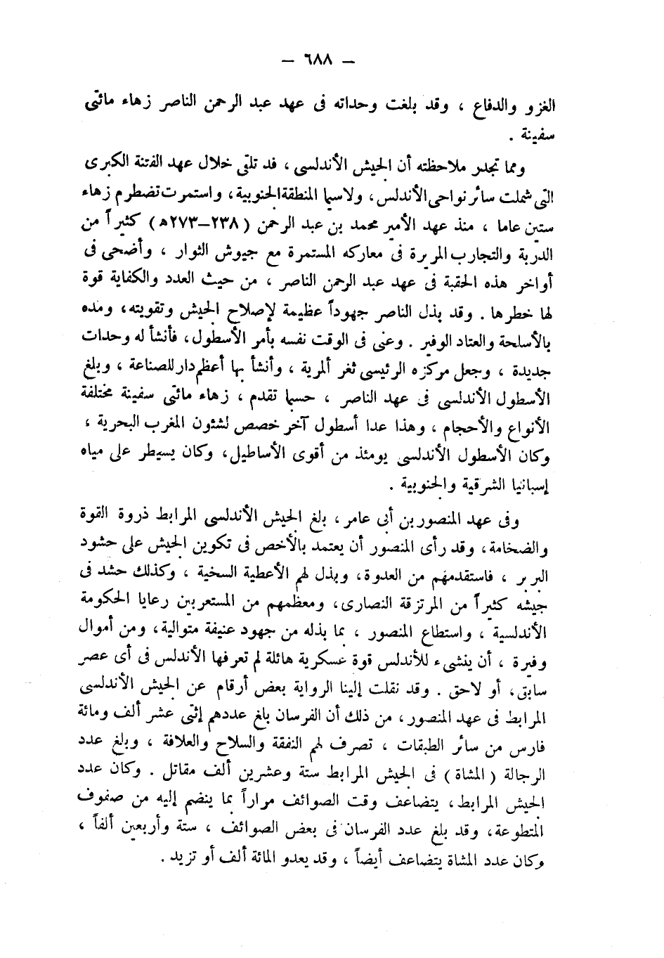 ومما تجدر ملاحظته أن الجيش الأندلسي، فد تلقى خلال عهد الفتنة الكبرى التي شملت سائر نواحي الأندلس، ولاسيما المنطقة الجنوبية، واستمرت تضطرم زهاء ستين عاماً، منذ عهد الأمير محمد بن عبد الرحمن (238 - 273 هـ) كثيراً من الدربة والتجارب المريرة في معاركه المستمرة مع جيوش الثوار، وأضحى في أواخر هذه الحقبة في عهد عبد الرحمن الناصر، من حيث العدد والكفاية قوة لها خطرها. وقد بذل الناصر جهوداً عظيمة لإصلاح الجيش وتقويته، ومده بالأسلحة والعتاد الوفير. وعنى في الوقت نفسه بأمر الأسطول، فأنشأ له وحدات جديدة، وجعل مركزه الرئيسي ثغر ألمرية، وأنشأ بها أعظم دار للصناعة، وبلغ الأسطول الأندلسي في عهد الناصر، حسبما تقدم، زهاء مائتي سفينة مختلفة الأنواع والأحجام، وهذا عدا أسطول آخر خصص لشئون المغرب البحرية، وكان الأسطول الأندلسي يومئذ من أقوى الأساطيل، وكان يسيطر على مياه إسبانيا الشرقية والجنوبية.