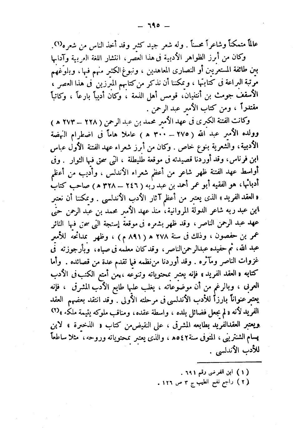 وكانت الفتنة الكبرى في عهد الأمير محمد بن عبد الرحمن (238 - 273 هـ) وولده الأمير عبد الله (275 - 300 هـ) عاملا هاماً في اضطرام النهضة الأدبية، والشعرية بنوع خاص. وكان من أبرز شعراء عهد الفتنة الأول عباس ابن فرناس، وقد أوردنا قصيدته في موقعة طليطلة، التي سحق فيها الثوار. وفي أواسط عهد الفتنة ظهر شاعر من أعظم شعراء الأندلس، وأديب من أعظم أدبائها، هو الفقيه أبو عمر أحمد بن عبد ربه (246 - 328 هـ) صاحب كتاب " العقد الفريد " الذي يعتبر من أعظم آثار الأدب الأندلسي. ويمكننا أن نعتبر ابن عبد ربه شاعر الدولة المروانية، منذ عهد الأمير محمد بن عبد الرحمن حتى عهد عبد الرحمن الناصر، وقد ظهر بشعره في موقعة إستجة التي سحق فيها الثائر عمر بن حفصون، وذلك في سنة 278 هـ (891 م)، وظهر بمدائحه للأمير عبد الله، ثم حفيده عبد الرحمن الناصر، وقد كان معلمه في صباه، وبأرجوزته في غزوات الناصر ومآثره. وقد أوردنا من نظمه فيما تقدم عدة من قصائده. وأما كتابه " العقد الفريد " فإنه يعتبر بمحتوياته وتنوعه، من أمتع الكتب في الأدب العربي، وبالرغم من أن موضوعاته، يغلب عليها طابع الأدب المشرقي، فإنه يعتبر عنواناً بارزاً للأدب الأندلسي في مرحلته الأولى. وقد انتقد بعضهم العقد الفريد لأنه " لم يجعل فضائل بلده، واسطة عقده، ومناقب ملوكه يتيمة ملكه " (¬2) ويعتبر العقد الفريد بطابعه المشرقي، على النقيض من كتاب " الذخيرة " لابن بسام الشنتريني، المتوفى سنة 542 هـ، والذي يعتبر بمحتوياته وروحه، مثلا ساطعاً للأدب الأندلسي.