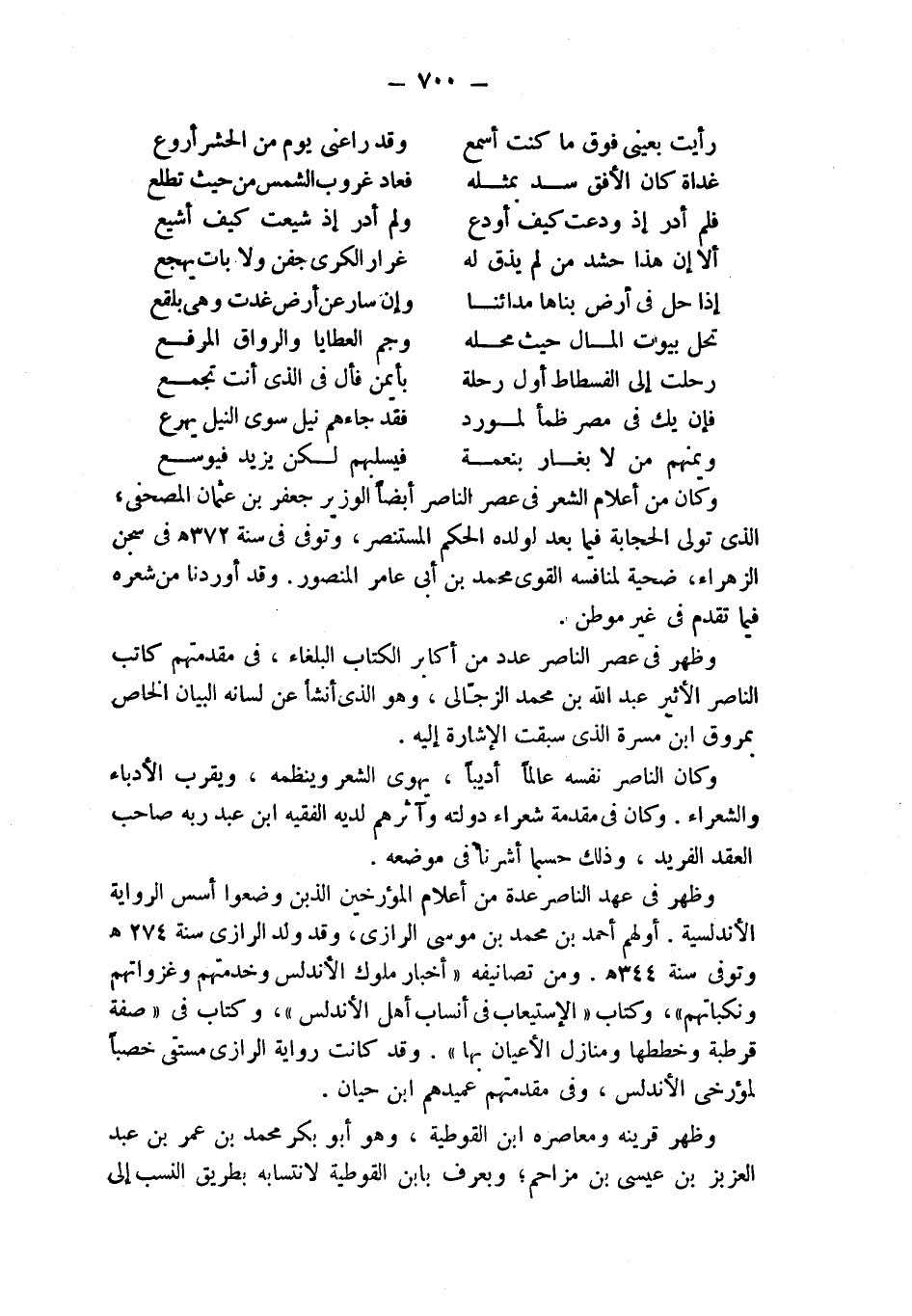 وظهر في عهد الناصر عدة من أعلام المؤرخين الذين وضعوا أسس الرواية الأندلسية. أولهم أحمد بن محمد بن موسى الرازي، وقد ولد الرازي سنة 274 هـ وتوفي سنة 344 هـ. ومن تصانيفه " أخبار ملوك الأندلس وخدمتهم وغزواتهم ونكباتهم "، وكتاب " الإستيعاب في أنساب أهل الأندلس "، وكتاب في " صفة قرطبة وخططها ومنازل الأعيان بها ". وقد كانت رواية الرازي مستقى خصباً لمؤرخي الأندلس، وفي مقدمتهم عميدهم ابن حيان.