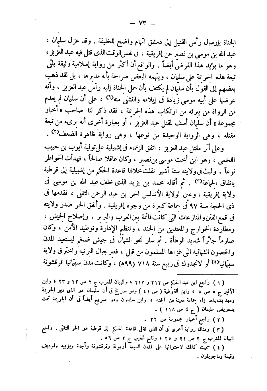 (¬1) راجع ابن عبد الحكم ص 212 و213؛ والبيان المغرب ج 2 ص 22 و23؛ وابن الأثير ج 5 ص 8، وابن القوطية (ص 41) وهو صريح في أن سليمان هو الذي دبر الجريمة وعهد بتنفيذها إلى جماعة معينة من الجند، وابن خلدون وهو صريح أيضا في أن الجريمة تمت بتحريض سليمان (ج 4 ص 118).