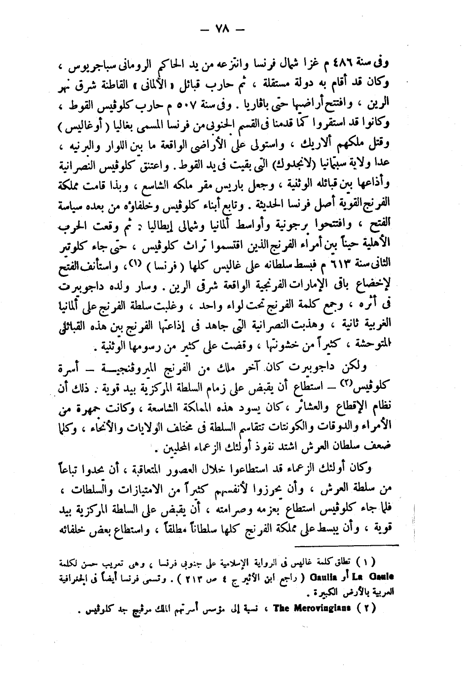 وفي سنة 486 م غزا شمال فرنسا وانتزعه من يد الحاكم الروماني سباجريوس، وكان قد أقام به دولة مستقلة، ثم حارب قبائل " الألماني " القاطنة شرق نهر الرين، وافتتح أراضيها حتى بافاريا. وفي سنة 507 م حارب كلوفيس القوط، وكانوا قد استقروا كما قدمنا في القسم الجنوبي من فرنسا المسمى بغاليا (أو غاليس) وقتل ملكهم ألاريك، واستولى على الأراضي الواقعة ما بين اللوار والبرنيه، عدا ولاية سبتمانيا (لانجدوك) التي بقيت في يد القوط. واعتنق كلوفيس النصرانية وأذاعها بين قبائله الوثنية، وجعل باريس مقر ملكه الشاسع، وبذا قامت مملكة الفرنج القوية أصل فرنسا الحديثة. وتابع أبناء كلوفيس وخلفاؤه من بعده سياسة الفتح، وافتتحوا برجونية وأواسط ألمانيا وشمالي إيطاليا. ثم وقعت الحرب الأهلية حينا بين أمراء الفرنج الذين اقتسموا تراث كلوفيس، حتى جاء كلوتير الثاني سنة 613 م فبسط سلطانه على غاليس كلها (فرنسا) (¬1)، واستأنف الفتح لإخضاع باقي الإمارات الفرنجية الواقعة شرقي الرين. وسار ولده داجوبيرت في أثره، وجمع كلمة الفرنج تحت لواء واحد، وغلبت سلطة الفرنج على ألمانيا الغربية ثانية، وهذبت النصرانية التي جاهد في إذاعتها الفرنج بين هذه القبائل المتوحشة، كثيراً من خشونتها، وقضت على كثير من رسومها الوثنية.
