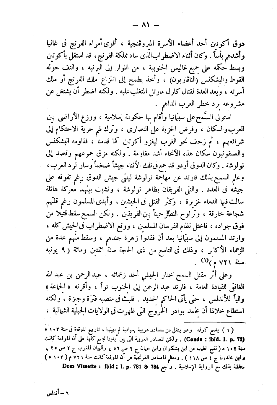 (¬1) يضع كوندى وهو ينقل عن مصادر عربية اسبانية لم يبينها، تاريخ الموقعة في سنة 103 هـ Conde: ibid.I.p. 72)) ولكن المصادر العربية التي بين أيدينا تجمع كلها على أن الموقعة كانت سنة 102 هـ (نفح الطيب عن ابن بشكوال وابن حيان ج 2 ص 56، والبيان المغرب ج 2 ص 25، وابن خلدون ج 4 ص 118). ومعظم المصادر الفرنجية على أن الموقعة كانت سنة 721 م (102 هـ) متفقة بذلك مع الرواية الإسلامية. راجع Dom Vissette: ibid ; I.p. 781 & 784