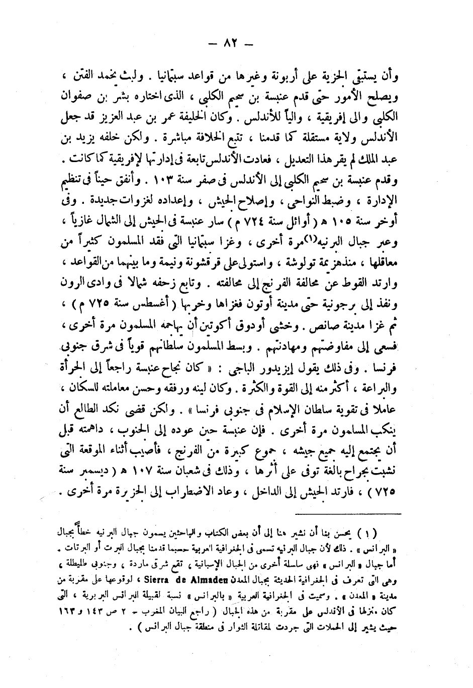 (¬1) يحسن بنا أن نشير هنا إلى أن بعض الكتاب والباحثين يسمون جبال البرنيه خطأً بجبال " البرانس " ذلك لأن جبال البرنيه تسمى في الجغرافية العربية حسبما قدمنا بجبال البرت أو البرتات. أما جبال " البرانس " فهي سلسلة أخرى من الجبال الإسبانية، تقع شرقي ماردة، وجنوبي طليطلة، وهي التي تعرف في الجغرافية الحديثة بجبال المعدن Sierra de Almaden، لوقوعها على مقربة من مدينة " المعدن ". وسيمت في الجغرافية العربية " بالبرانس " نسبة لقبيلة البرانس البربرية، التي كان منزلها في الأندلس على مقربة من هذه الجبال (راجع البيان المغرب ج 2 ص 143 و163 حيث يشير إلى الحملات التي جردت لمقاتلة الثوار في منطقة جبال البرانس).
