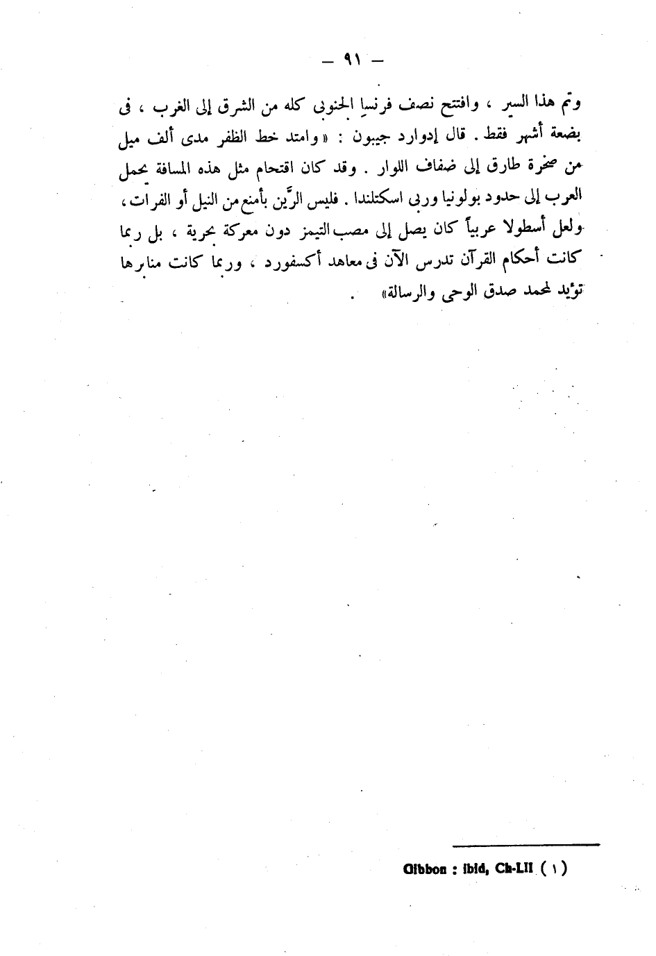 وتم هذا السير، وافتتح نصف فرنسا الجنوبي كله من الشرق إلى الغرب، في بضعة أشهر فقط. قال إدوارد جيبون: " وامتد خط الظفر مدى ألف ميل من صخرة طارق إلى ضفاف اللوار. وقد كان اقتحام مثل هذه المسافة يحمل العرب إلى حدود بولونيا وربى اسكتلندا. فليس الرَّين بأمنع من النيل أو الفرات، ولعل أسطولا عربيا كان يصل إلى مصب التيمز دون معركة بحرية، بل ربما كانت أحكام القرآن تدرس الآن في معاهد أكسفورد وربما كانت منابرها تؤيد لمحمد صدق الوحي والرسالة ". (¬1)
