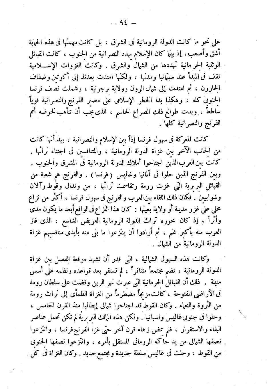 كانت المعركة في سهول فرنسا إذاً بين الإسلام والنصرانية، بيد أنها كانت من الجانب الآخر بين غزاة الدولة الرومانية، والمتنافسين في اجتناء تراثها. كانت بين العرب الذين اجتاحوا أملاك الدولة الرومانية في المشرق والجنوب. وبين الفرنج الذين حلوا في ألمانيا وغاليس (فرنسا). والفرنج هم شعبة من القبائل البربرية التي غزت رومة وتقاسمت تراثها، من وندال وقوط وآلان وشوابيين. فكان ذلك اللقاء بين العرب والفرنج في سهول فرنسا، أكثر من نزاع محلي على غزو مدينة أو ولاية بعينها: كان هذا النزاع في الواقع أبعد ما يكون مدى وأثرا، إذ كان محوره تراث الدولة الرومانية العريض الشاسع، الذي فاز العرب منه بأكبر غنم، ثم أرادوا أن ينتزعوا ما بقي منه بأيدي منافسيهم غزاة الدولة الرومانية من الشمال.