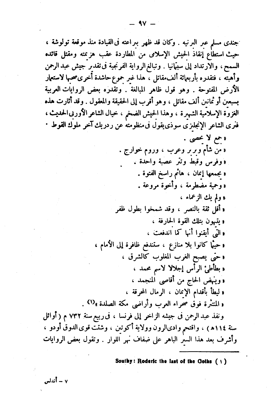 جندى مسلم عبر البرنيه. وكان قد ظهر ببراعته في القيادة منذ موقعة تولوشة، حيث استطاع إنقاذ الجيش الإسلامي من المطاردة عقب هزيمته ومقتل قائده السمح، والارتداد إلى سبتمانيا. وتبالغ الرواية الفرنجية في تقدير جيش عبد الرحمن وأهبته، فتقدره بأربعمائة ألف مقاتل، هذا غير جموع حاشدة أخرى صحبها لاستعمار الأرض المفتوحة. وهو قول ظاهر المبالغة. وتقدره بعض الروايات العربية بسبعين أو ثمانين ألف مقاتل، وهو أقرب إلى الحقيقة والمعقول. وقد أثارت هذه الغزوة الإسلامية الشهيرة، وهذا الجيش الضخم، خيال الشاعر، الأوربي الحديث، فنرى الشاعر الإنجليزي سوذي يقول في منظومته عن ردريك آخر ملوك القوط.