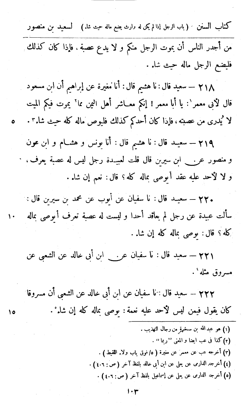 219 - سَعِيدٌ قَالَ: نا هُشَيْمٌ، قَالَ: أنا يُونُسُ وَهِشَامٌ وَابْنُ عَوْنٍ وَمَنْصُورٌ عَنِ ابْنِ سِيرِينَ، قَالَ: قُلْتُ لِعَبِيدَةَ: " رَجُلٌ لَيْسَ لَهُ عَصَبَةٌ تُعْرَفُ، وَلَا لِأَحَدٍ عَلَيْهِ عَقْدٌ §أَيُوصِي بِمَالِهِ كُلِّهِ؟ قَالَ: «نَعَمْ إِنْ شَاءَ»