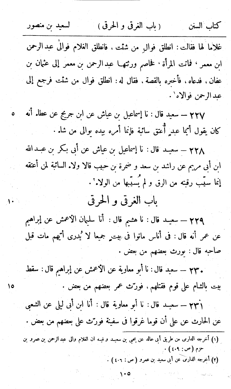 231 - سَعِيدٌ قَالَ: نا أَبُو مُعَاوِيَةَ، قَالَ: أنا ابْنُ أَبِي لَيْلَى عَنِ الشَّعْبِيِّ، عَنِ الْحَارِثِ، عَنْ عَلِيٍّ «أَنَّ قَوْمًا غَرِقُوا فِي سَفِينَةٍ §فَوَرَّثَ عَلِيٌّ بَعْضَهُمْ مِنْ بَعْضٍ»