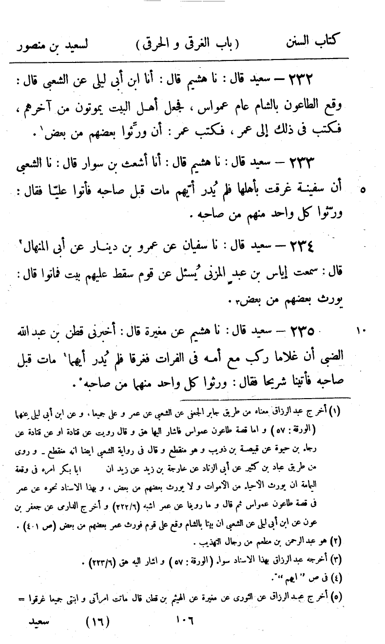 233 - سَعِيدٌ قَالَ: نا هُشَيْمٌ، قَالَ: أنا أَشْعَثُ بْنُ سَوَّارٍ، قَالَ: نا الشَّعْبِيُّ، أَنَّ سَفِينَةً، غَرِقَتْ بِأَهْلِهَا فَلَمْ يُدْرَ أَيُّهُمْ مَاتَ قَبْلَ صَاحِبِهِ فَأَتَوْا عَلِيًّا فَقَالَ: «§وَرِّثُوا كُلَّ وَاحِدٍ مِنْهُمْ مِنْ صَاحِبِهِ»