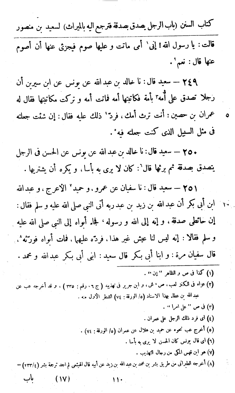 249 - سَعِيدٌ قَالَ: نا خَالِدُ بْنُ عَبْدِ اللَّهِ، عَنْ يُونُسَ، عَنِ ابْنِ سِيرِينَ، أَنَّ رَجُلًا تَصَدَّقَ عَلَى أُمِّهِ بِأَمَةٍ فَكَاتَبَتْهَا أمه، فَمَاتَتْ أُمُّهُ وَتَرَكَتْ مُكَاتَبَتَهَا، فَقَالَ لَهُ عِمْرَانُ بْنُ حُصَيْنٍ: «§أَنْتَ تَرِثُ أُمَّكَ» فَرَدَّ ذَلِكَ عَلَيْهِ فَقَالَ: إِنْ شِئْتَ جَعَلْتَهُ فِي مِثْلِ السَّبِيلِ الَّذِي كُنْتَ جَعَلْتَهُ فِيهِ "