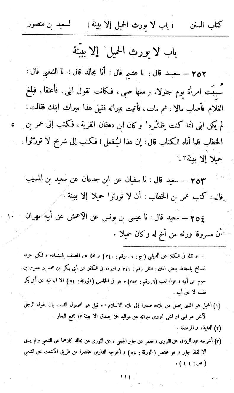 253 - سَعِيدٌ قَالَ: نا سُفْيَانُ، عَنِ ابْنِ جُدْعَانَ، عَنْ سَعِيدِ بْنِ الْمُسَيِّبِ، قَالَ: كَتَبَ عُمَرُ بْنُ الْخَطَّابِ: «§أَنْ لَا تُوَرِّثُوا حَمِيلًا إِلَّا بِبَيِّنَةٍ»
