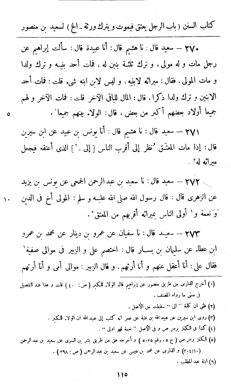 273 - سَعِيدٌ قَالَ: نا سُفْيَانُ، عَنْ عَمْرِو بْنِ دِينَارٍ، عَنْ مُحَمَّدِ بْنِ عَمْرِو بْنِ عَطَاءٍ، عَنْ سُلَيْمَانَ بْنِ يَسَارٍ، قَالَ: اخْتَصَمَ عَلِيٌّ وَالزُّبَيْرُ فِي مَوَالِي صَفِيَّةَ فَقَالَ عَلِيٌّ: " §أَنَا أَعْقِلُ عَنْهُمْ وَأَنَا أَرِثُهُمْ، وَقَالَ الزُّبَيْرُ: مَوَالِي أُمِّي وَأَنَا أَرِثُهُمْ -[116]- فَنَادَاهُمَا عَبْدُ الرَّحْمَنِ بْنُ عَوْفٍ: إِنَّكُمَا لَا تَدْرِيَانِ أَيُّكُمَا أَسْرَعُ مَوْتًا , فَسَكَتَا "