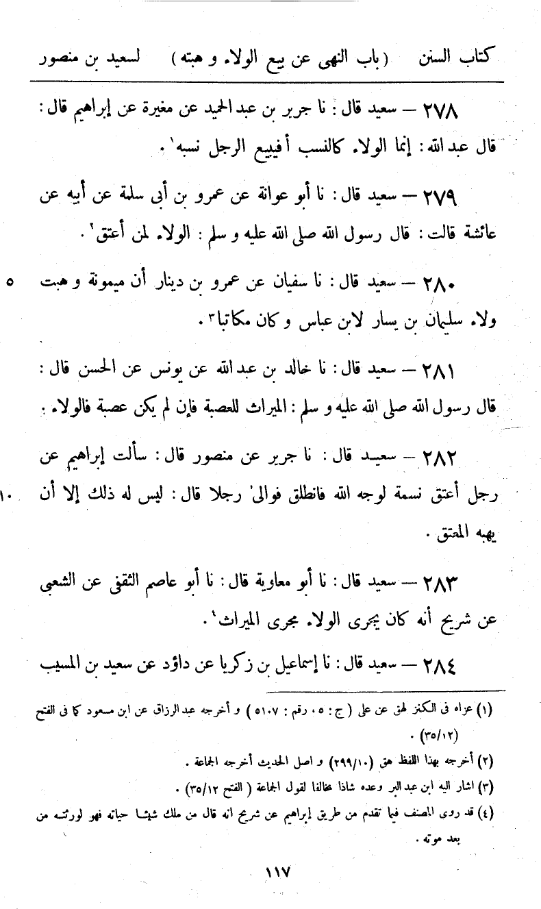 278 - سَعِيدٌ قَالَ: نا جَرِيرُ بْنُ عَبْدِ الْحَمِيدِ، عَنْ مُغِيرَةَ، عَنْ إِبْرَاهِيمَ قَالَ عَبْدُ اللَّهِ: «§إِنَّمَا الْوَلَاءُ كَالنَّسَبِ أَفَيَبِيعُ الرَّجُلُ نَسَبَهُ»
