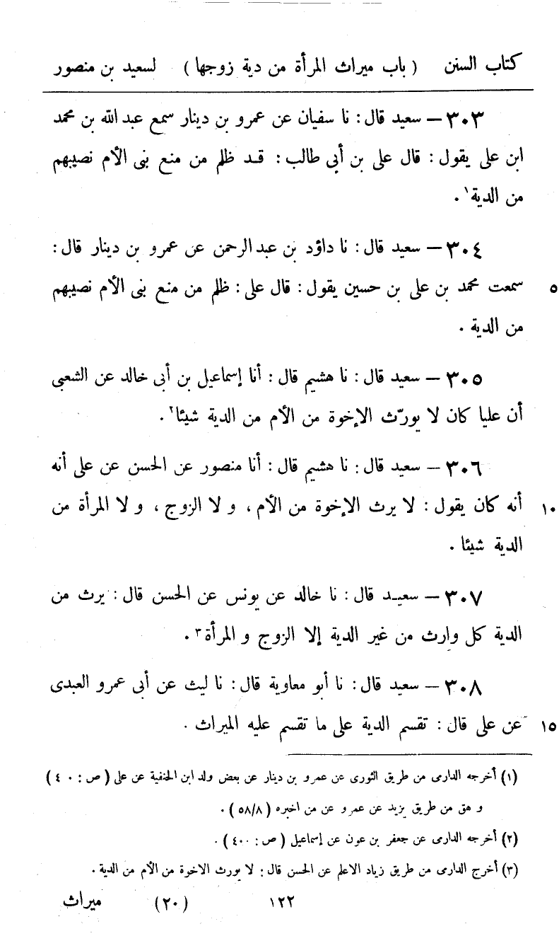306 - سَعِيدٌ قَالَ: نا هُشَيْمٌ، قَالَ: أنا مَنْصُورٌ، عَنِ الْحَسَنِ، عَنْ عَلِيٍّ أَنَّهُ كَانَ يَقُولُ: «§لَا يَرِثُ الْإِخْوَةُ مِنَ الْأُمِّ، وَلَا الزَّوْجُ، وَلَا الْمَرْأَةُ مِنَ الدِّيَةِ شَيْئًا»