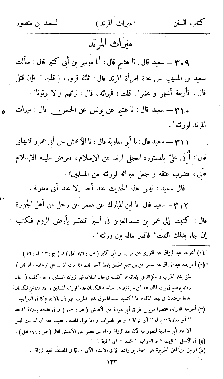 312 - سَعِيدٌ قَالَ: نا ابْنُ الْمُبَارَكِ، عَنْ مَعْمَرٍ، عَنْ رَجُلٍ مِنْ أَهْلِ الْجَزِيرَةِ قَالَ: كَتَبْتُ إِلَى عُمَرَ بْنِ عَبْدِ الْعَزِيزِ فِي أَسِيرٍ تَنَصَّرَ بِأَرْضِ الرُّومِ، فَكَتَبَ: «§إِنْ جَاءَ بِذَلِكَ الثَّبَتُ فَاقْسِمْ مَالَهُ بَيْنَ وَرَثَتِهِ»