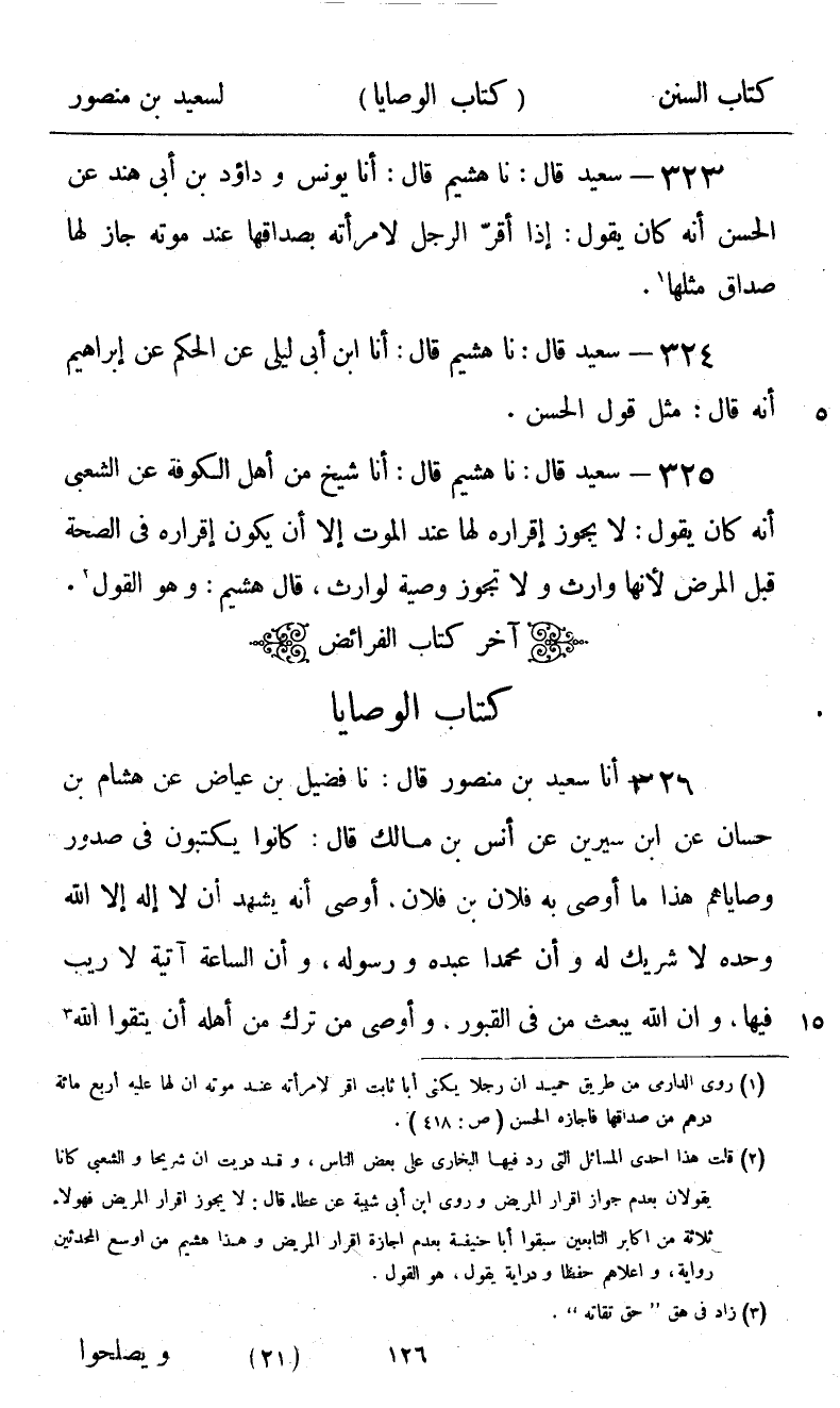 326 - أنا سَعِيدُ بْنُ مَنْصُورٍ قَالَ: نا فُضَيْلُ بْنُ عِيَاضٍ، عَنْ هِشَامِ بْنِ حَسَّانَ، عَنِ ابْنِ سِيرِينَ، عَنْ أَنَسِ بْنِ مَالِكٍ، قَالَ: " كَانُوا يَكْتُبُونَ فِي صَدْرِ وَصَايَاهُمْ: §هَذَا مَا أَوْصَى بِهِ فُلَانُ بْنُ فُلَانٍ، أَوْصَى أَنَّهُ يَشْهَدُ أَنْ لَا إِلَهَ إِلَّا اللَّهُ وَحْدَهُ لَا شَرِيكَ لَهُ، وَأَنَّ مُحَمَّدًا عَبْدُهُ وَرَسُولُهُ، وَأَنَّ السَّاعَةَ آتِيَةٌ لَا رَيْبَ فِيهَا، وَأَنَّ اللَّهَ يَبْعَثُ مَنْ فِي الْقُبُورِ، وَأَوْصَى مَنْ تَرَكَ مِنْ أَهْلِهِ أَنْ يَتَّقُوا اللَّهَ -[127]-، وَيُصْلِحُوا ذَاتَ بَيْنِهِمْ، وَيُطِيعُوا اللَّهَ وَرَسُولَهُ إِنْ كَانُوا مُؤْمِنِينَ، وَأَوْصَاهُمْ بِمَا أَوْصَى بِهِ إِبْرَاهِيمُ بَنِيهِ وَيَعْقُوبُ {يَا بَنِيَّ إِنَّ اللَّهَ اصْطَفَى لَكُمُ الدِّينَ فَلَا تَمُوتُنَّ إِلَّا وَأَنْتُمْ مُسْلِمُونَ} [البقرة: 132]
