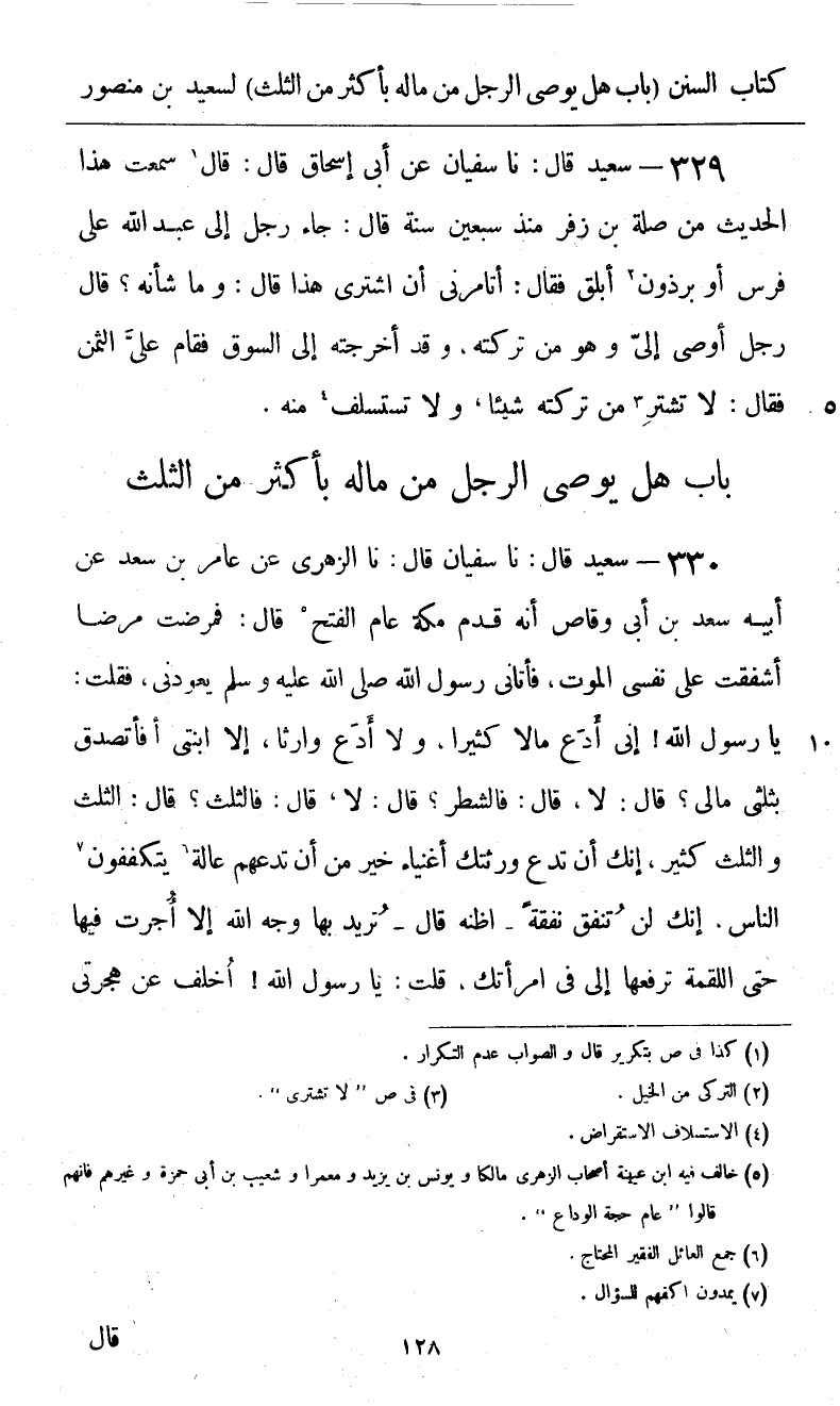 330 - سَعِيدٌ قَالَ: نا سُفْيَانُ، قَالَ: نا الزُّهْرِيُّ، عَنْ عَامِرِ بْنِ سَعْدٍ، عَنْ أَبِيهِ سَعْدِ بْنِ أَبِي وَقَّاصٍ أَنَّهُ قَدِمَ مَكَّةَ عَامَ الْفَتْحِ قَالَ: فَمَرِضْتُ مَرَضًا أَشْفَقْتُ عَلَى نَفْسِي الْمَوْتَ، فَأَتَانِي رَسُولُ اللَّهِ صَلَّى اللهُ عَلَيْهِ وَسَلَّمَ يَعُودُنِي، فَقُلْتُ: يَا رَسُولَ اللَّهِ إِنِّي أَدَعُ مَالًا كَثِيرًا، وَلَا أَدَعُ وَارِثًا إِلَّا ابْنَتِي أَفَأَتَصَدَّقُ بِثُلُثَيْ مَالِي؟ قَالَ: «لَا» قَالَ: فَالشَّطْرُ؟ قَالَ: «لَا» قَالَ: فَالثُّلُثُ؟ قَالَ: «§الثُّلُثُ , وَالثُّلُثُ كَثِيرٌ، إِنَّكَ أَنْ تَدَعَ وَرَثَتَكَ أَغْنِيَاءَ خَيْرٌ مِنْ أَنْ تَدَعَهُمْ عَالَةً يَتَكَفَّفُونَ النَّاسَ. إِنَّكَ لَنْ تُنْفِقَ نَفَقَةً - أَظُنُّهُ قَالَ - تُرِيدُ بِهَا وَجْهَ اللَّهِ إِلَّا أُجِرْتَ فِيهَا حَتَّى اللُّقْمَةَ تَرْفَعُهَا إِلَى فِي امْرَأَتِكَ» ، قُلْتُ: يَا رَسُولَ اللَّهِ أُخَلَّفُ عَنْ هِجْرَتِي -[129]- قَالَ: «إِنَّكَ لَنْ تُخَلَّفَ بَعْدِي فَتَعْمَلَ عَمَلًا تُرِيدُ بِهِ وَجْهَ اللَّهِ إِلَّا ازْدَدْتَ بِهِ رِفْعَةً وَدَرَجَةً، وَلَعَلَّكَ أَنْ تُخَلَّفَ حَتَّى يَنْتَفِعَ بِكِ أَقْوَامٌ وَيُضَرَّ بِكَ آخَرُونَ، اللَّهُمَّ أَمْضِ لِأَصْحَابِي هِجْرَتَهُمْ، وَلَا تَرُدَّهُمْ عَلَى أَعْقَابِهِمْ، لَكِنِ الْبَائِسُ سَعْدُ بْنُ خَوْلَةَ يَرْثِي لَهُ أَنْ مَاتَ بِمَكَّةَ»