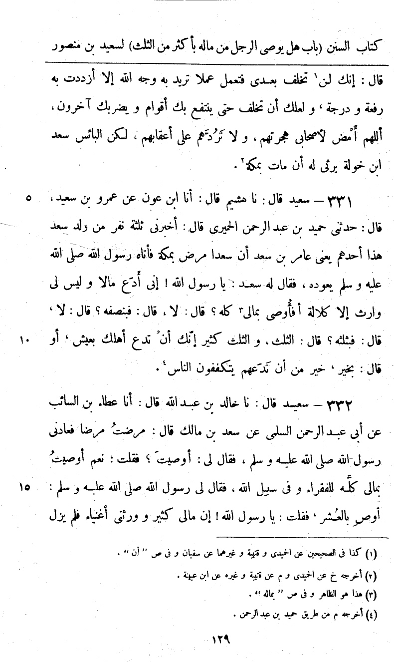 331 - سَعِيدٌ قَالَ: نا هُشَيْمٌ، قَالَ: أنا ابْنُ عَوْنٍ، عَنْ عَمْرِو بْنِ سَعِيدٍ، قَالَ: حَدَّثَنِي حُمَيْدُ بْنُ عَبْدِ الرَّحْمَنِ الْحِمْيَرِيُّ، قَالَ: أَخْبَرَنِي ثَلَاثَةُ نَفَرٍ مِنْ وَلَدِ سَعْدٍ، هَذَا أَحَدُهُمْ يَعْنِي عَامِرَ بْنَ سَعْدٍ أَنَّ سَعْدًا مَرِضَ بِمَكَّةَ فَأَتَاهُ رَسُولُ اللَّهِ صَلَّى اللهُ عَلَيْهِ وَسَلَّمَ يَعُودُهُ، فَقَالَ لَهُ سَعْدٌ: يَا رَسُولَ اللَّهِ إِنِّي أَدَعُ مَالًا وَلَيْسَ لِي وَارِثٌ إِلَّا كَلَالَةٌ أَفَأُوصِي بِمَالِي كُلِّهِ؟ قَالَ: «لَا» قَالَ: فَبِنِصْفِهِ؟ قَالَ: «لَا» ، قَالَ: فَبِثُلُثِهِ؟ قَالَ: " §الثُّلُثُ، وَالثُّلُثُ كَثِيرٌ إِنَّكَ أَنْ تَدَعَ أَهْلَكَ بِعَيْشٍ - أَوْ قَالَ: بِخَيْرٍ - خَيْرٌ مِنْ أَنْ تَدَعَهُمْ يَتَكَفَّفُونَ النَّاسَ "