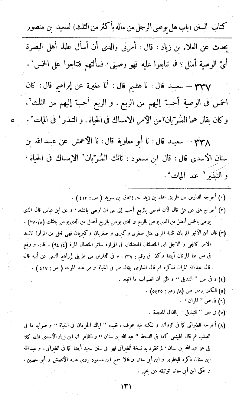 337 - سَعِيدٌ قَالَ: نا هُشَيْمٌ، قَالَ: أنا مُغِيرَةُ، عَنْ إِبْرَاهِيمَ، قَالَ: " §كَانَ الْخُمُسُ فِي الْوَصِيَّةِ أَحَبَّ إِلَيْهِمْ مِنَ الرُّبُعِ، وَالرُّبُعُ أَحَبَّ إِلَيْهِمْ مِنَ الثُّلُثِ، وَكَانَ يُقَالُ: هُمَا الْمُرَّيَانِ مِنَ الْأَمْرِ: الْإِمْسَاكُ فِي الْحَيَاةِ، وَالتَّبْذِيرُ فِي الْمَمَاتِ "