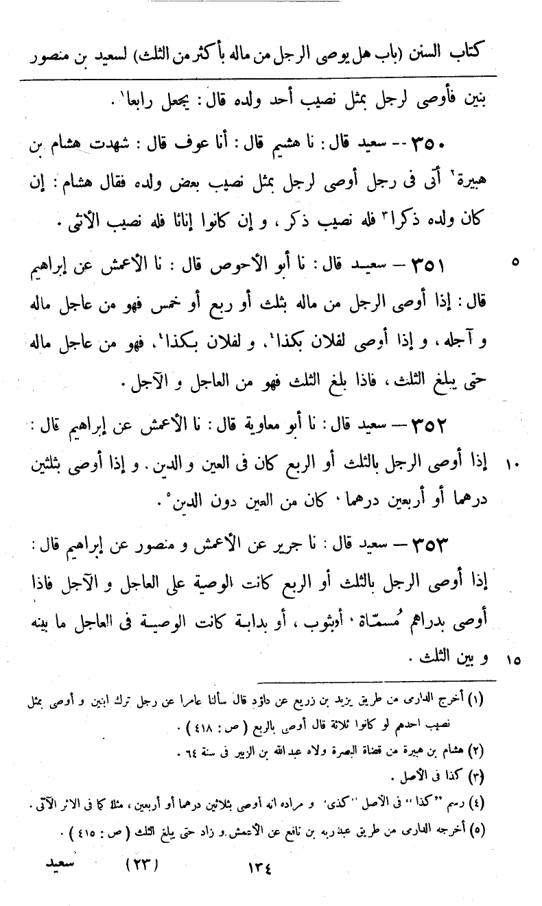 351 - سَعِيدٌ قَالَ: نا أَبُو الْأَحْوَصِ، قَالَ: نا الْأَعْمَشُ، عَنْ إِبْرَاهِيمَ قَالَ «§إِذَا أَوْصَى الرَّجُلُ مِنْ مَالِهِ بِثُلُثٍ أَوْ رُبْعٍ أَوْ خُمُسٍ فَهُوَ مِنْ عَاجِلِ مَالِهِ وَآجِلِهِ، وَإِذَا أَوْصَى لِفُلَانٍ بِكَذَا، وَلِفُلَانٍ بِكَذَا، فَهُوَ مِنْ عَاجِلِ مَالِهِ حَتَّى يَبْلُغَ الثُّلُثَ، فَإِذَا بَلَغَ الثُّلُثَ فَهُوَ مِنَ الْعَاجِلِ وَالْآجِلِ»