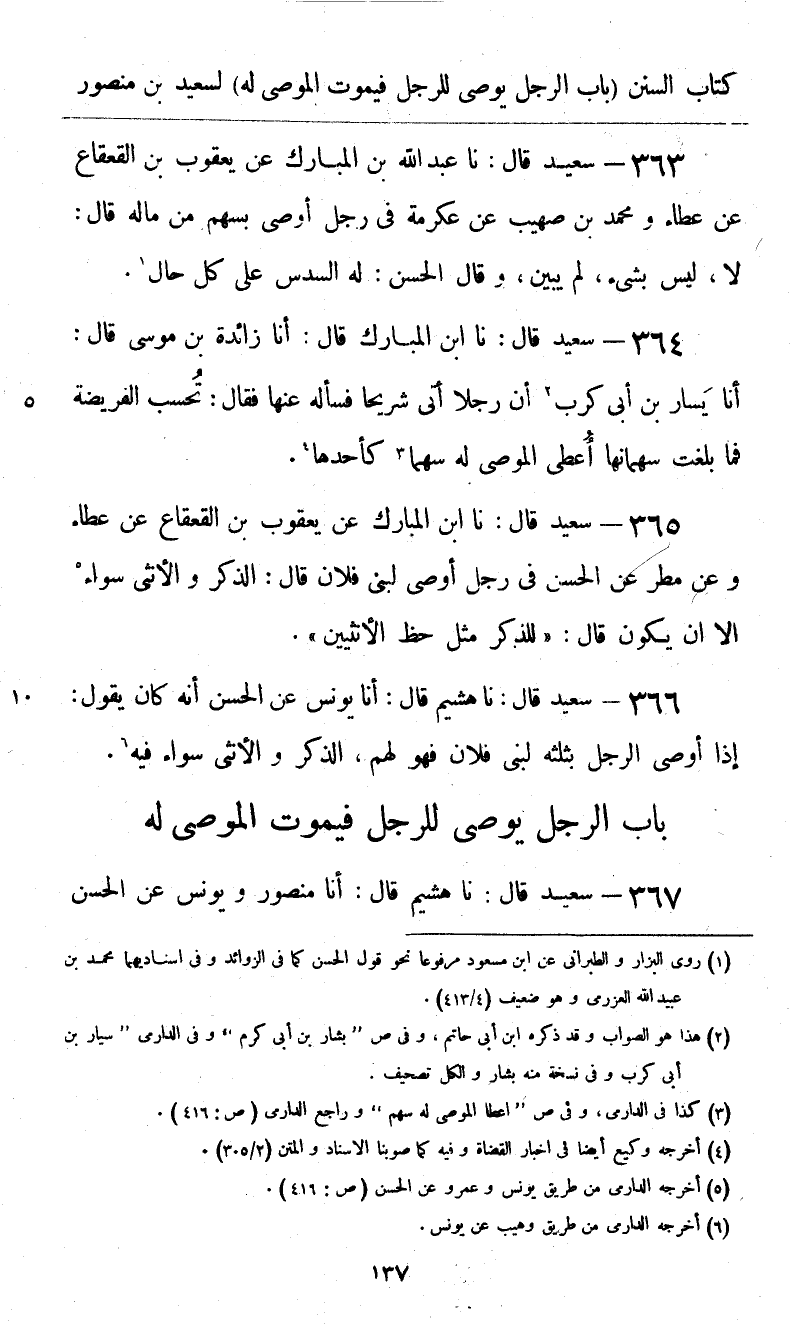 363 - سَعِيدٌ قَالَ: نا عَبْدُ اللَّهِ بْنُ الْمُبَارَكِ، عَنْ يَعْقُوبَ بْنِ الْقَعْقَاعِ، عَنْ عَطَاءٍ، وَمُحَمَّدِ بْنِ صُهَيْبٍ، عَنْ عِكْرِمَةَ، فِي رَجُلٍ أَوْصَى بِسَهْمٍ مِنْ مَالِهِ , قَالَ: «§لَا , لَيْسَ بِشَيْءٍ، لَمْ يُبَيِّنْ» ، وَقَالَ الْحَسَنُ: «لَهُ السُّدُسُ عَلَى كُلِّ حَالٍ»