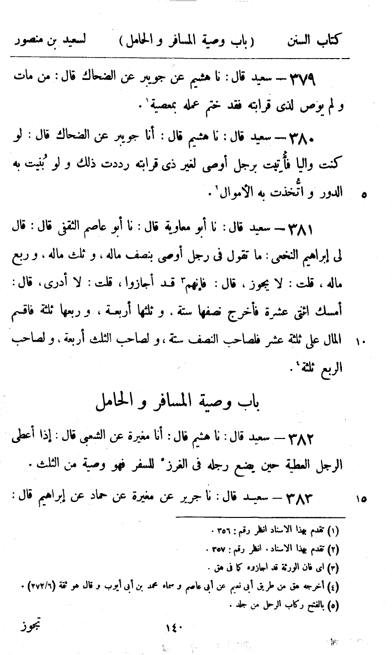 383 - سَعِيدٌ قَالَ: نا جَرِيرٌ، عَنْ مُغِيرَةَ، عَنْ حَمَّادٍ، عَنْ إِبْرَاهِيمَ قَالَ -[141]-: «§تَجُوزُ وَصِيِّتُهُ وَلَا يَكُونُ فِي الثُّلُثِ»
