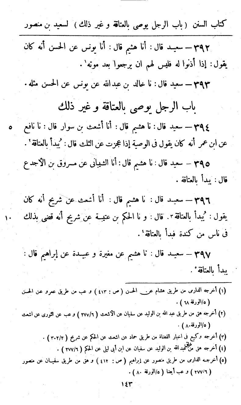 397 - سَعِيدٌ قَالَ: نا هُشَيْمٌ، عَنْ مُغِيرَةَ، وَعُبَيْدَةَ، عَنْ إِبْرَاهِيمَ، قَالَ: «§يُبْدَأُ بِالْعَتَاقَةِ»