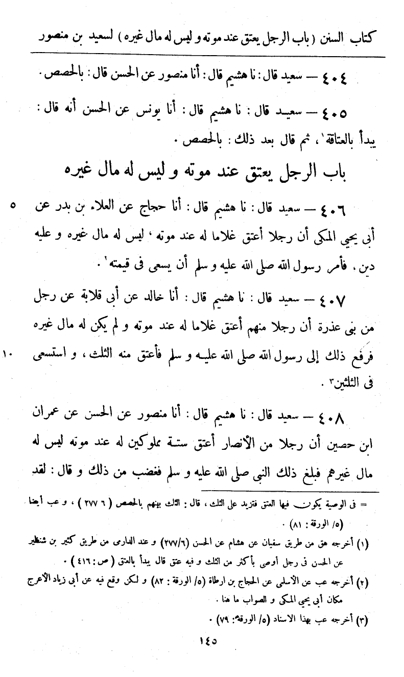 408 - سَعِيدٌ قَالَ: نا هُشَيْمٌ، قَالَ: أنا مَنْصُورٌ، عَنِ الْحَسَنِ، عَنْ عِمْرَانَ بْنِ حُصَيْنٍ، أَنَّ رَجُلًا مِنَ الْأَنْصَارِ أَعْتَقَ سِتَّةَ مَمْلُوكِينَ لَهُ عِنْدَ مَوْتِهِ، لَيْسَ لَهُ مَالٌ غَيْرُهُمْ، فَبَلَغَ ذَلِكَ النَّبِيَّ صَلَّى اللهُ عَلَيْهِ وَسَلَّمَ، فَغَضِبَ مِنْ ذَلِكَ وَقَالَ: «§لَقَدْ -[146]- هَمَمْتُ أَنْ لَا أُصَلِّيَ عَلَيْهِ» . ثُمَّ دَعَا مَمْلُوكِيهِ فَجَزَّأَهُمْ ثَلَاثَةَ أَجْزَاءٍ فَأَقْرَعَ بَيْنَهُمْ، فَأَعْتَقَ اثْنَيْنِ وَأَرَقَّ أَرْبَعَةً ".