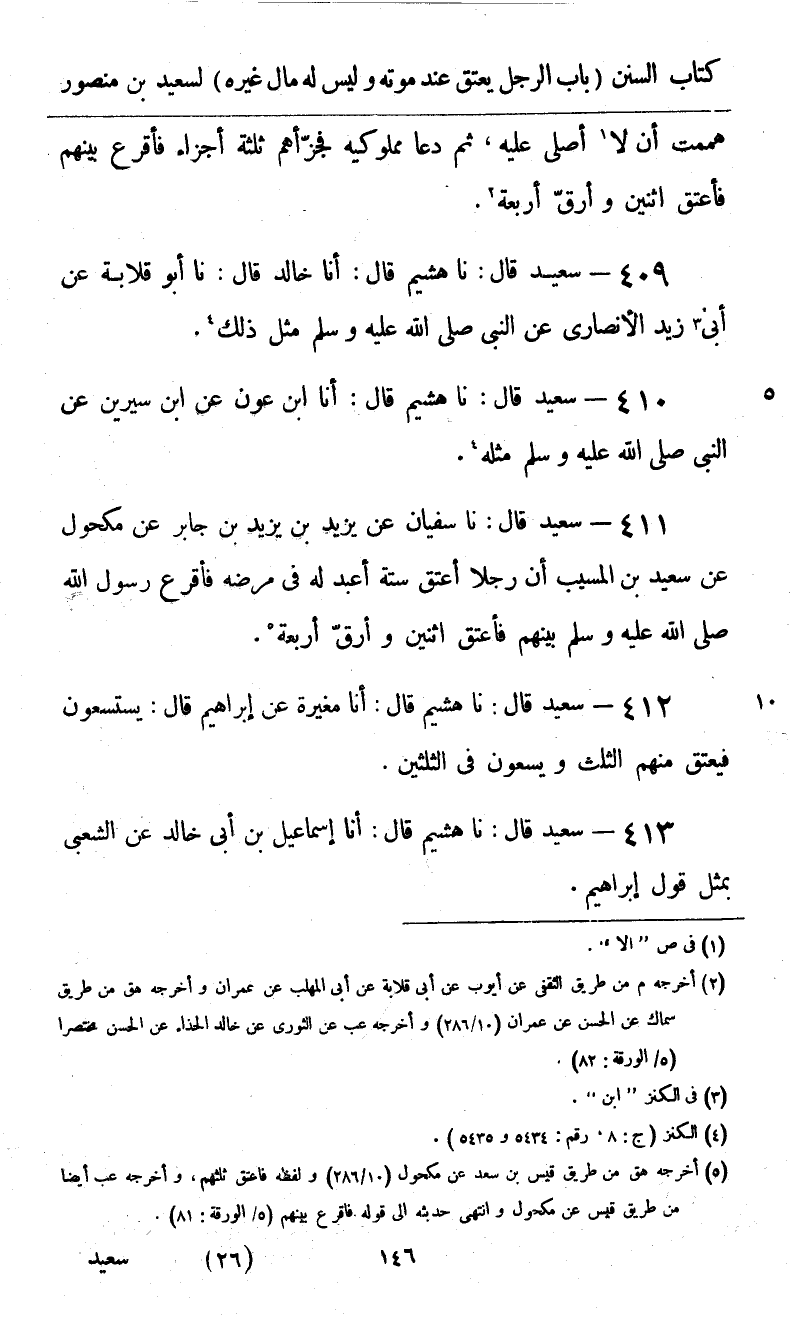 411 - سَعِيدٌ قَالَ: نا سُفْيَانُ، عَنْ يَزِيدَ بْنِ يَزِيدَ بْنِ جَابِرٍ، عَنْ مَكْحُولٍ، عَنْ سَعِيدِ بْنِ الْمُسَيِّبِ، أَنَّ رَجُلًا أَعْتَقَ سِتَّةَ أَعْبُدٍ لَهُ فِي مَرَضِهِ، فَأَقْرَعَ رَسُولُ اللَّهِ صَلَّى اللهُ عَلَيْهِ وَسَلَّمَ بَيْنَهُمْ، §فَأَعْتَقَ اثْنَيْنِ وَأَرَقَّ أَرْبَعَةً "