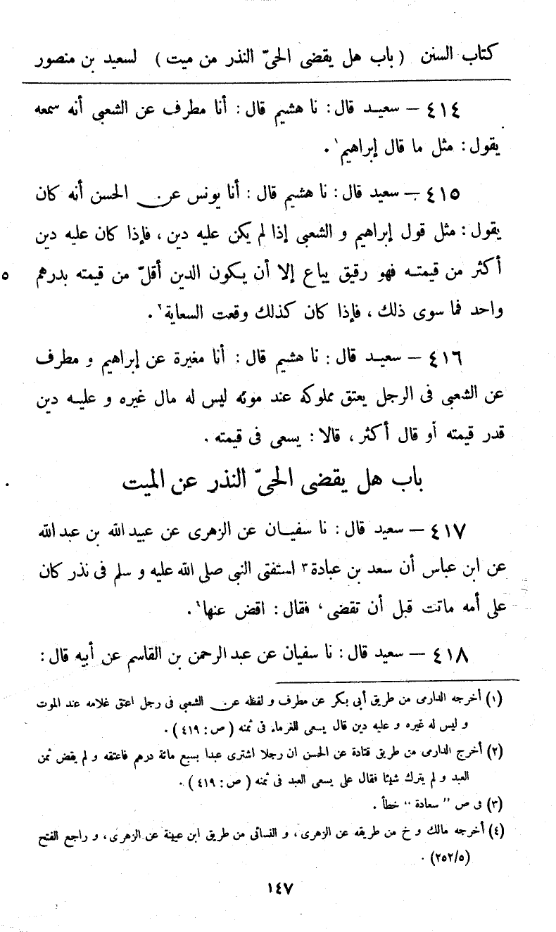 417 - سَعِيدٌ قَالَ: نا سُفْيَانُ، عَنِ الزُّهْرِيِّ، عَنْ عُبَيْدِ اللَّهِ بْنِ عَبْدِ اللَّهِ، عَنِ ابْنِ عَبَّاسٍ أَنَّ سَعْدَ بْنَ عُبَادَةَ اسْتَفْتَى النَّبِيَّ صَلَّى اللهُ عَلَيْهِ وَسَلَّمَ فِي نَذْرٍ كَانَ عَلَى أُمِّهِ مَاتَتْ قَبْلَ أَنْ تَقْضِيَ، فَقَالَ: «§اقْضِ عَنْهَا»