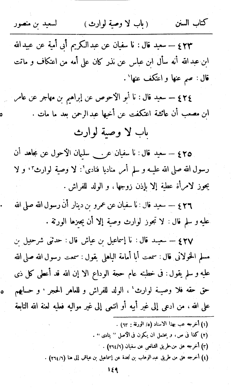 426 - سَعِيدٌ قَالَ: نا سُفْيَانُ، عَنْ عَمْرِو بْنِ دِينَارٍ، أَنَّ رَسُولَ اللَّهِ صَلَّى اللهُ عَلَيْهِ وَسَلَّمَ قَالَ: «§لَا تَجُوزُ لِوَارِثٍ وَصِيَّةٌ إِلَّا أَنْ يُجِيزَهَا الْوَرَثَةُ»