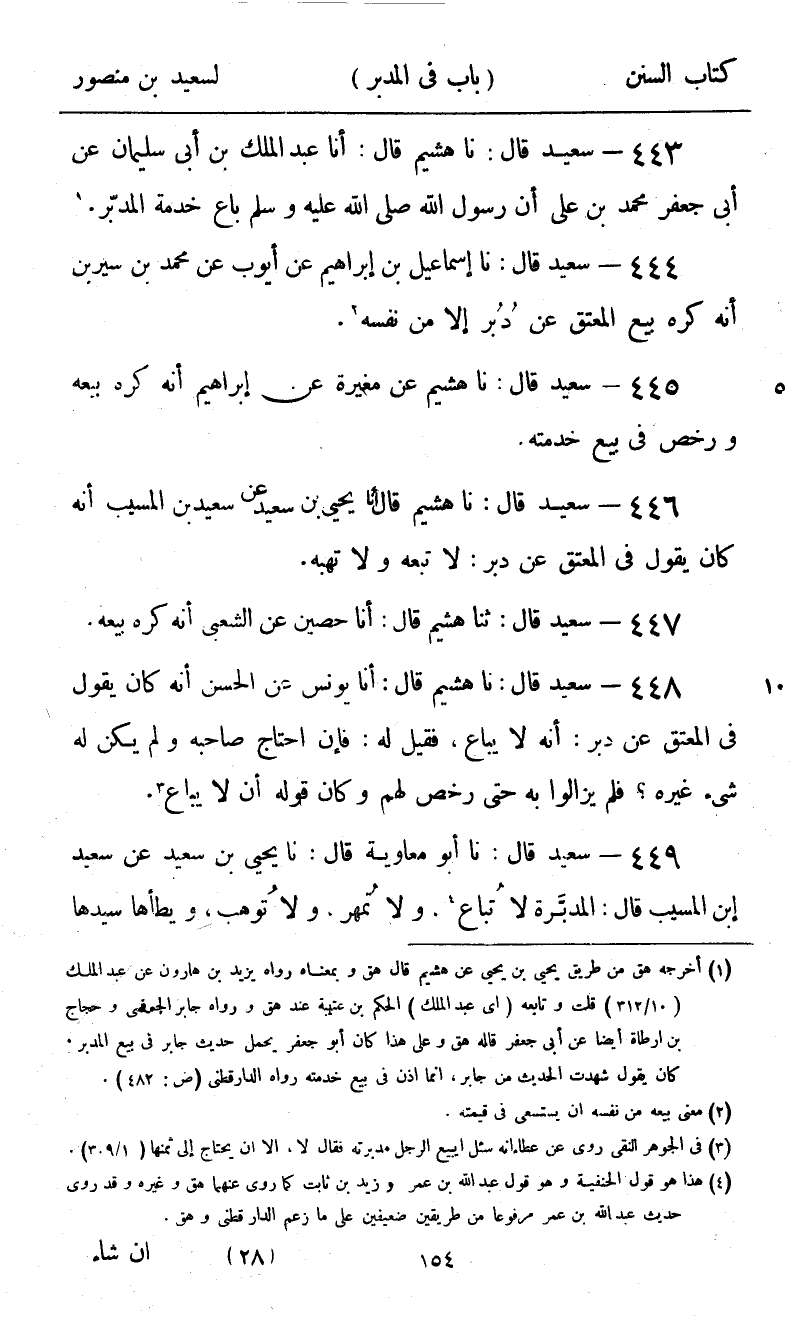 449 - سَعِيدٌ قَالَ: نا أَبُو مُعَاوِيَةَ، قَالَ: نا يَحْيَى بْنُ سَعِيدٍ، عَنْ سَعِيدِ بْنِ الْمُسَيِّبِ، قَالَ: «§الْمُدَبَّرَةُ لَا تُبَاعُ، وَلَا تُمْهَرُ، وَلَا تُوهَبُ، وَيَطَؤُهَا سَيِّدُهَا -[155]- إِنْ شَاءَ، وَوَلَدُهَا بِمَنْزِلَتِهَا»