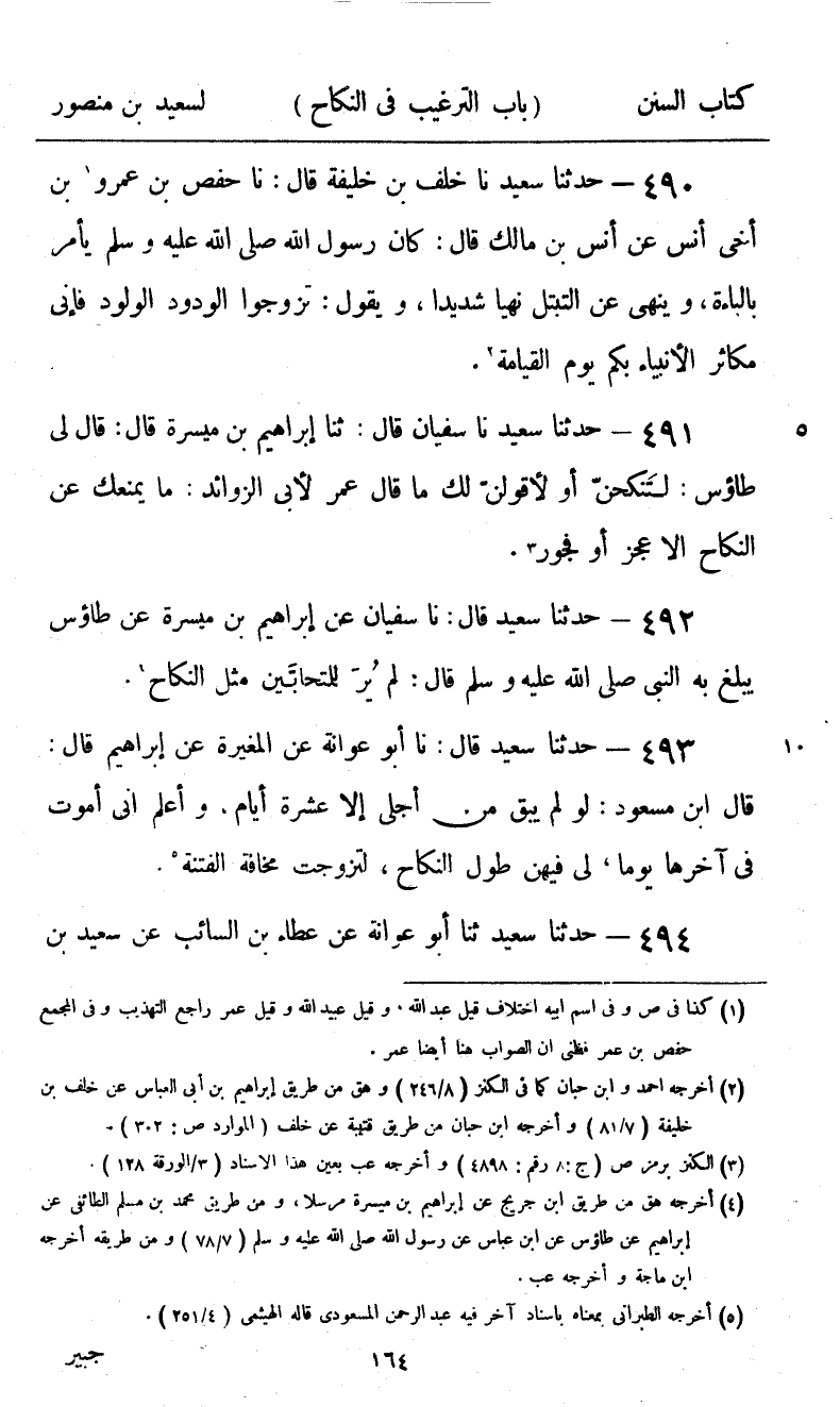 491 - حَدَّثَنَا سَعِيدٌ، نا سُفْيَانُ، قَالَ: ثنا إِبْرَاهِيمُ بْنُ مَيْسَرَةَ قَالَ: قَالَ لِي طَاوُسٌ: §لَتَنْكِحَنَّ أَوْ لَأَقُولَنَّ لَكَ مَا قَالَ عُمَرُ لِأَبِي الزَّوَائِدِ: مَا يَمْنَعُكَ عَنِ النِّكَاحِ إِلَّا عَجْزٌ أَوْ فُجُورٌ "