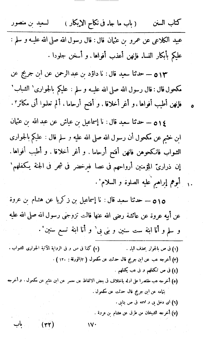 515 - حَدَّثَنَا سَعِيدٌ قَالَ: نا إِسْمَاعِيلُ بْنُ زَكَرِيَّا، عَنْ هِشَامِ بْنِ عُرْوَةَ، عَنْ أَبِيهِ عُرْوَةَ، عَنْ عَائِشَةَ، رَضِيَ اللَّهُ عَنْهَا قَالَتْ: «§تَزَوَّجَنِي رَسُولُ اللَّهِ صَلَّى اللهُ عَلَيْهِ وَسَلَّمَ وَأَنَا ابْنَةُ سِتِّ سِنِينَ، وَبَنَى بِي وَأَنَا ابْنَةُ تِسْعِ سِنِينَ»