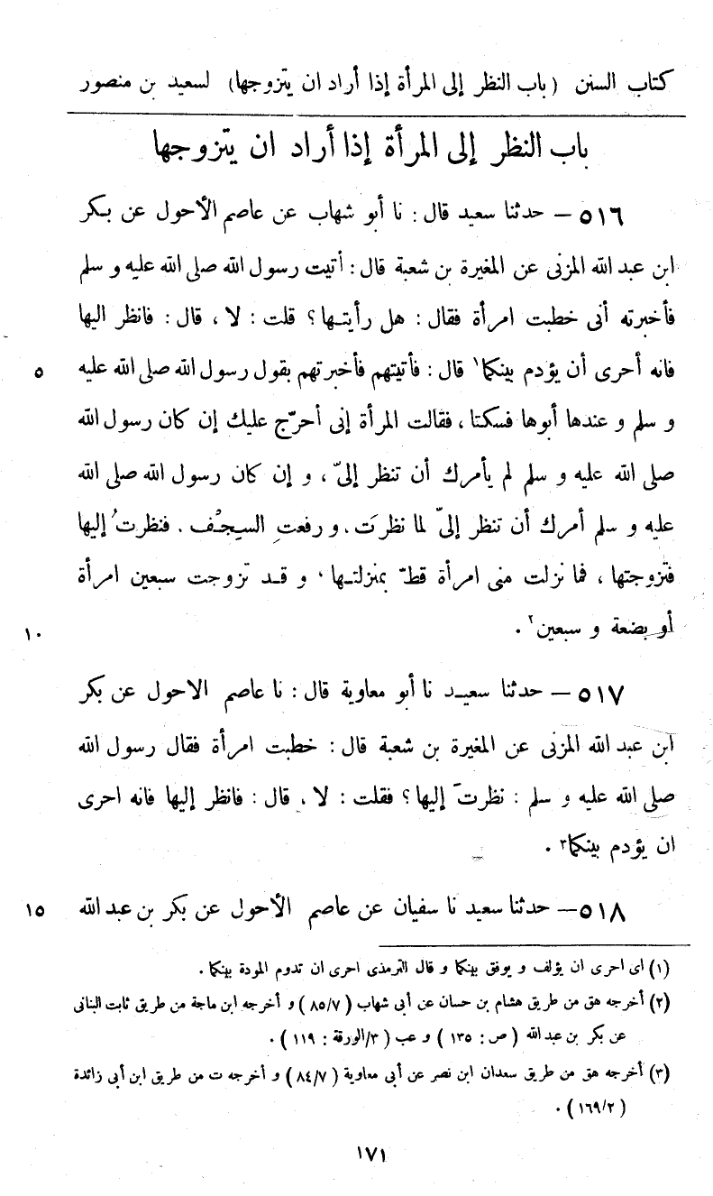 517 - حَدَّثَنَا سَعِيدٌ، نا أَبُو مُعَاوِيَةَ، قَالَ: نا عَاصِمٌ الْأَحْوَلُ، عَنْ بَكْرِ بْنِ عَبْدِ اللَّهِ الْمُزَنِيِّ، عَنِ الْمُغِيرَةِ بْنِ شُعْبَةَ، قَالَ: خَطَبْتُ امْرَأَةً، فَقَالَ رَسُولُ اللَّهِ صَلَّى اللهُ عَلَيْهِ وَسَلَّمَ: «نَظَرْتَ إِلَيْهَا» ؟ فَقُلْتُ: لَا. قَالَ: «§فَانْظُرْ إِلَيْهَا؛ فَإِنَّهُ أَحْرَى أَنْ يُؤْدَمَ بَيْنَكُمَا» .