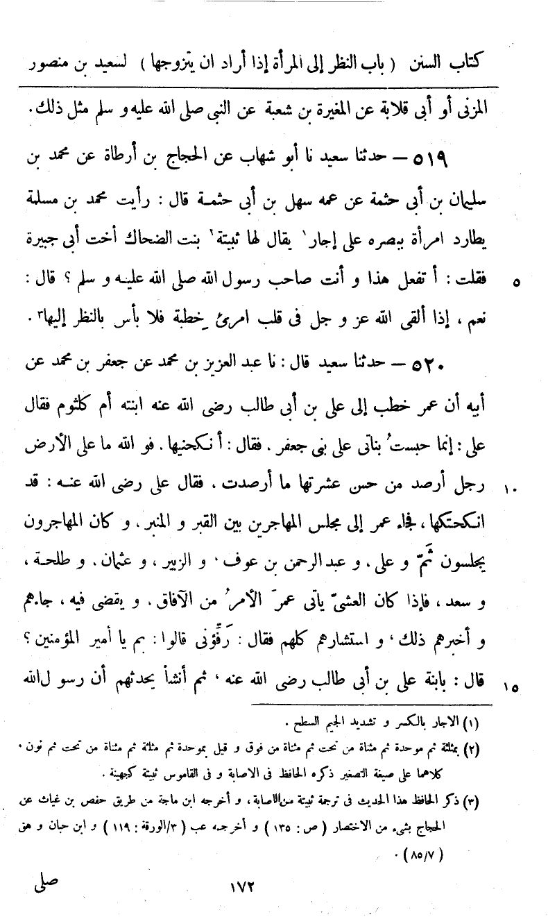 519 - حَدَّثَنَا سَعِيدٌ، نا أَبُو شِهَابٍ، عَنِ الْحَجَّاجِ بْنِ أَرْطَاةَ، عَنْ مُحَمَّدِ بْنِ سُلَيْمَانَ بْنِ أَبِي حَثْمَةَ، عَنْ عَمِّهِ سَهْلِ بْنِ أَبِي حَثْمَةَ قَالَ: رَأَيْتُ مُحَمَّدَ بْنَ مَسْلَمَةَ يُطَارِدُ امْرَأَةً بِبَصَرِهِ عَلَى إِجَّارٍ يُقَالُ لَهَا ثُبَيْتَةُ بِنْتُ الضَّحَّاكِ أُخْتُ أَبِي جُبَيْرَةَ، فَقُلْتُ: أَتَفْعَلُ هَذَا وَأَنْتَ صَاحِبُ رَسُولِ اللَّهِ صَلَّى اللهُ عَلَيْهِ وَسَلَّمَ؟ قَالَ: نَعَمْ، §إِذَا أَلْقَى اللَّهُ عَزَّ وَجَلَّ فِي قَلْبِ امْرِئٍ خِطْبَةً، فَلَا بَأْسَ بِالنَّظَرِ إِلَيْهَا "