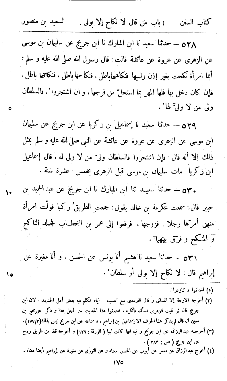 530 - حَدَّثَنَا سَعِيدٌ، ثنا ابْنُ الْمُبَارَكِ، نا ابْنُ جُرَيْجٍ، عَنْ عَبْدِ الْحَمِيدِ بْنِ جُبَيْرٍ قَالَ: سَمِعْتُ عِكْرِمَةَ بْنَ خَالِدٍ يَقُولُ: «§جَمَعَتِ الطَّرِيقُ رَكْبًا، فَوَلَّتِ امْرَأَةٌ مِنْهُنَّ أَمْرَهَا رَجُلًا، فَزَوَّجَهَا، فَرُفِعُوا إِلَى عُمَرَ بْنِ الْخَطَّابِ، فَجَلَدَ النَّاكِحَ وَالْمُنْكِحَ، وَفَرَّقَ بَيْنَهُمَا»