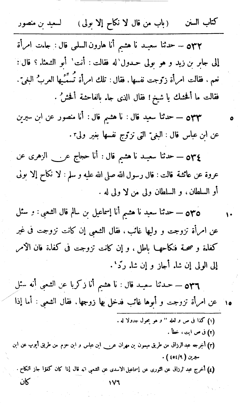 533 - حَدَّثَنَا سَعِيدٌ قَالَ: نا هُشَيْمٌ، قَالَ: أنا مَنْصُورٌ، عَنِ ابْنِ سِيرِينَ، عَنِ ابْنِ عَبَّاسٍ، قَالَ: «§الْبَغِيُّ الَّتِي تُزَوِّجُ نَفْسَهَا بِغَيْرِ وَلِيٍّ»
